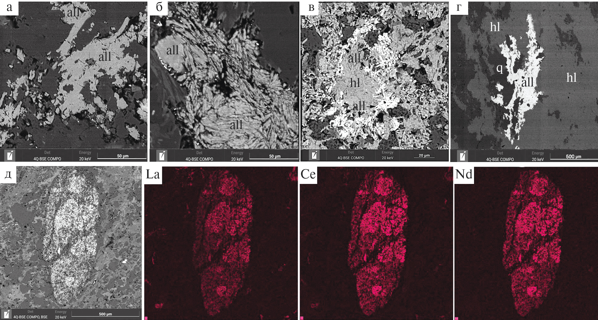 В горизонте переслаивания песчаников и сланцев каранской подсвиты (см. рис. 1г, обр. С41/213) встречены относительно крупные (до 1 мм по удлинению) ксеноморфные выделения алланита нестехиометричного состава ((Ca0.71 Ce0.22 La0.07 Pr0.05 Nd0.11)1.16 (Al0.31 Fe0.50 Mg0.03)0.84 (Si1.98 Al1.02) Σ3 O8; (Ca0.67 Ce0.26 La0.07 Pr0.04 Nd0.11) Σ1.15 (Al0.33 Fe0.50 Mg0.02) Σ0.85 (Si1.98 Al1.02) Σ3 O8; (Ca1.76 Ce0.17 La0.07 Nd0.07 Pr0.04) Σ2.11 (Al2.07 Fe0.78 Mg0.04) Σ2.89 (Si3.54 Al0.46) Σ4 O14), в которых суммарное количество РЗЭ (при Ce > > Nd > La > Pr) колеблется от 20.48 мас. % до 33.37 мас. %. Близкие по составу соединения ((Ca1.31 La0.18 Ce0.42 Nd0.08 Pr0.06) Σ2.05 (Al2.03 Fe0.81 Mg0.10 Mn0.01) Σ2.95 (Si3.70 Al0.30) Σ4 O14 и (Ca0.55 Ce0.21 La0.10 Pr0.03 Nd0.06) Σ0.95 (Al0.63 Fe0.33 Mg0.03 Mn0.01 Ti0.05) Σ1.05 (Si2.65 Al0.35) Σ3 O8) с суммарным содержанием РЗЭ – 20.01 мас. % и 18.51 мас. % соответственно были обнаружены и в конгломератах кузъелгинской подсвиты, что свидетельствует об их широком распространении по всему разрезу изученных подсвит.
