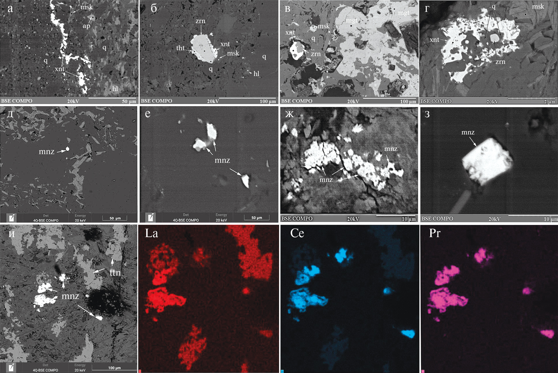 Сокращения: xnt – ксенотим, zrn – циркон, msk – мусковит, ap – апатит, hl – хлорит, mgt – магнетит, q – кварц, mnz – монацит.