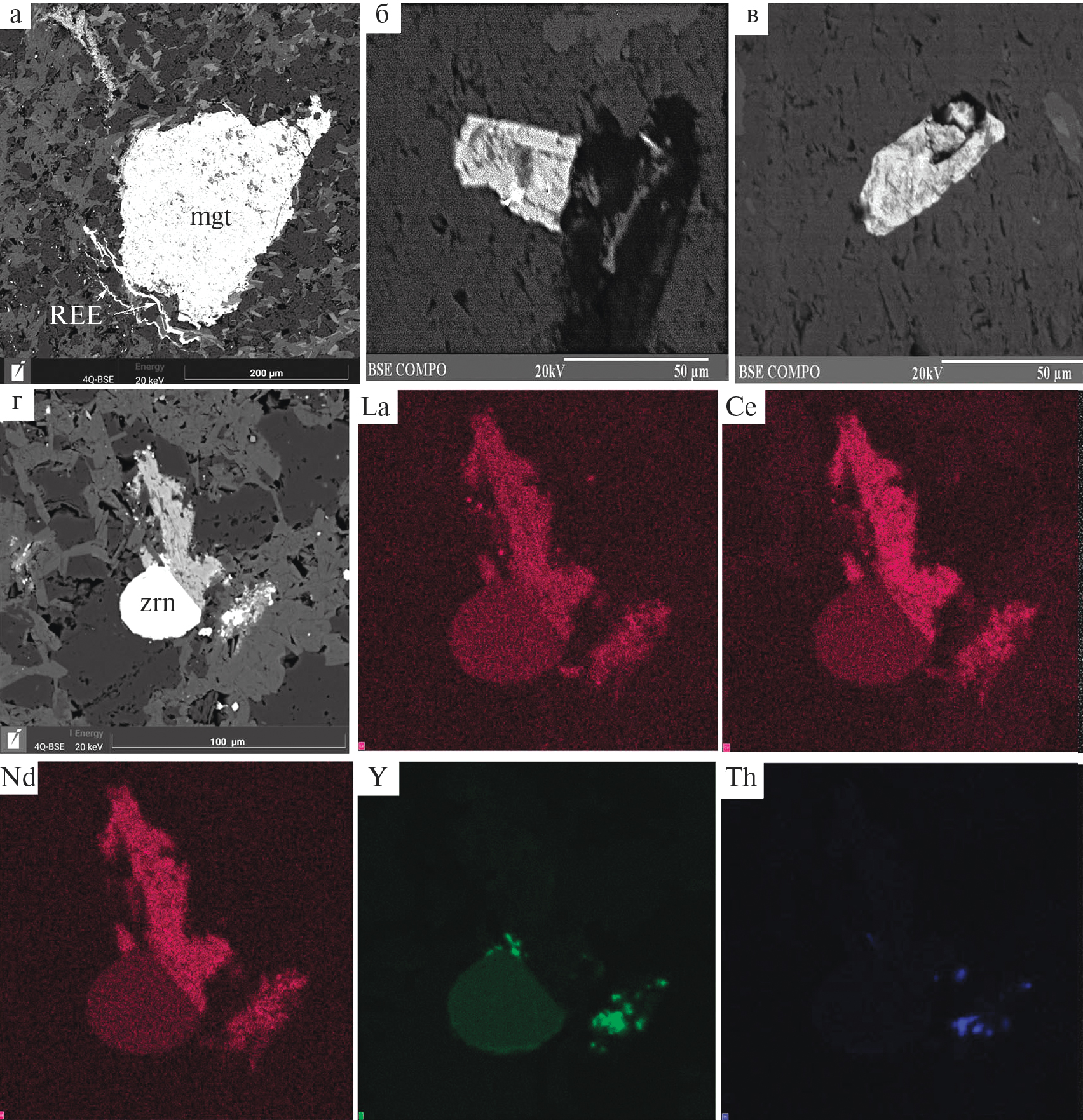 Сокращения: REE – неидентифицированные соединения, zrn – циркон, mgt – магнетит.