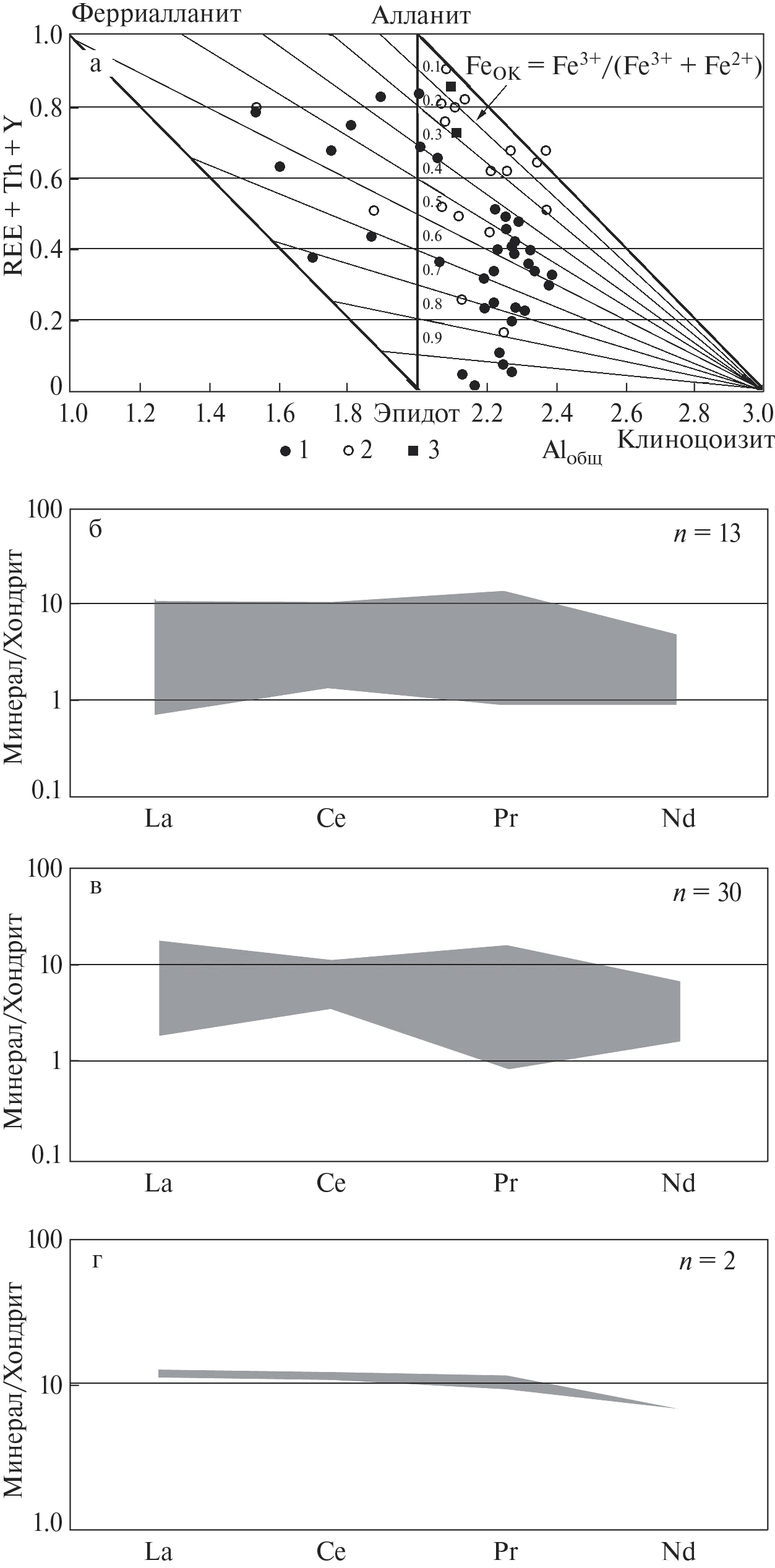 Сложная история формирования и преобразования пород комплекса во многом определяяет условия генезиса редкоземельной минерализации. Самый распространенный минерал – алланит-(Се) присутствует во всех разновидностях пород. Особенности его химического состава выявляются при анализе диаграммы REE + Th + Y – Alобщ, предложенной И. Пет- риком с соавторами [Petrik et al., 1995] (рис. 6а). Для сравнительного анализа приводятся материалы по редкоземельной минерализации в метаморфизованных терригенных комплексах западного склона Южного Урала (Суранско-Интуратовской и Улу-Елгинско-Кудашмановской зонам), детальная характеристика которых дана в ранее опубликованных работах [Ковалев и др., 2017; Ковалев, Ковалев, 2022]. Как видно из диаграммы, алланиты всех рассматриваемых комплексов не различаются между собой. Для них характерно наличие практически полного изоморфного ряда между алланитом и эпидотом (за исключнгием минерализации Улу-Елгинской зоны, что объясняется малым количеством анализов) и значительный разброс точек составов по окисленности железа, что подтверждается прямыми геологическими наблюдениями (наличие магнетитовой и гематитовой минерализации).