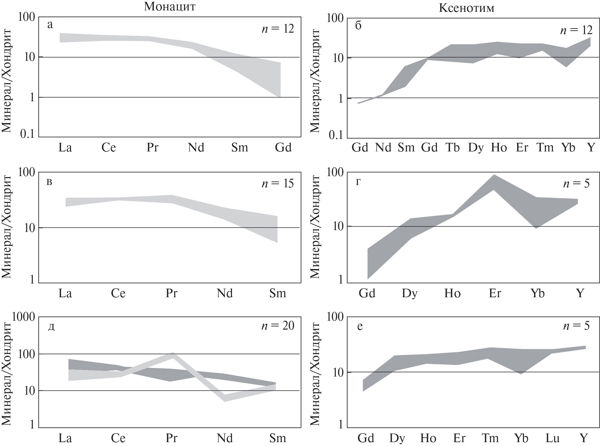Рис. 7. Графики нормализованных содержаний РЗЭ в монаците и ксенотиме из метаморфизованных терригенных пород шатакского комплекса (а, б), Суранско-Интуратовской зоны (в, г) и Улу-Елгинско-Кудашмановской зоны (д, е). Хондрит ‒ по работе [Sun, McDonough, 1989]
