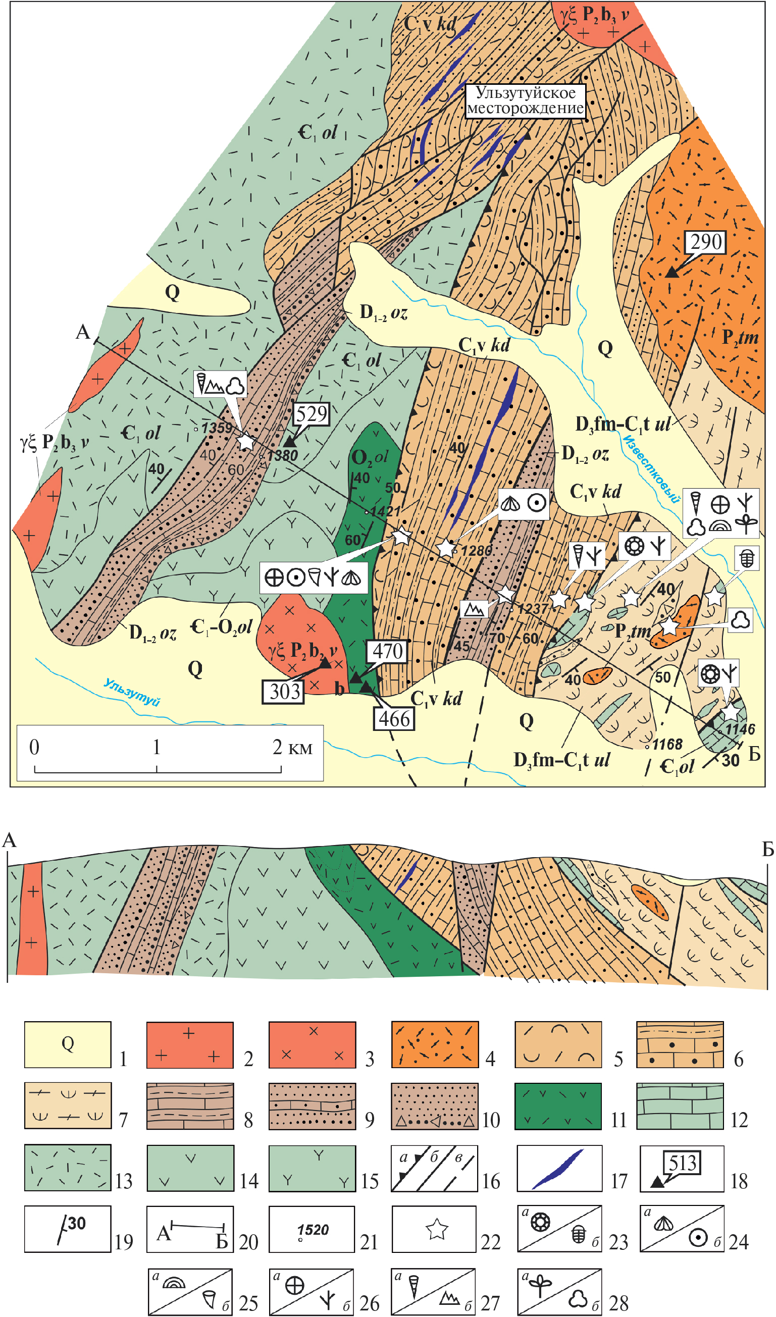 1 – четвертичные отложения (Q); 2–3 – бичурский комплекс (P2b): 2 – граниты, лейкограниты, граносиениты (ãîP2b3); 3 – монцодиориты (µP2b2); 4 – тамирская свита (P2tm); 5–6 – кыджимитская толща (C1vkd): 5 – туфы кислого состава; 6 – переслаивание туфоалевролитов, туфоаргиллитов, туфов, туффитов, детритовых известняков (тефротурбидиты); 7 – ульзутуйская толща (D3fm–С1t ul) – переслаивание пестроцветных туфопесчаников, туфоалевролитов, туфоаргиллитов, алевритистых известняков, отторженцы известняков, вулканитов; 8–10 – озернинская толща (D1–2oz): 8 – переслаивание кремнисто-углистых аргиллитов, известняков; 9 – переслаивание известковистых песчаников, алевролитов, с прослоями алевритистых известняков; 10 – песчаники с прослоями конгломератов и гравелитов; 11–15 – олдындинская свита (Є1–О2ol): 11 – андезиты, андезидациты (О2ol); 12 – биогермные известняки (Є1ol); 13 – риолиты, дациты (Є1ol); 14 – андезибазальты (Є1ol); 15 – плагиориолиты и их туфы (Є1–О2ol); 16 – тектонические нарушения: а – надвиги, б, в – прочие достоверные (б) и предполагаемые (в); 17 – колчеданно-полиметаллические рудные тела; 18 – место отбора проб и изотопный возраст пород; 19 – элементы залегания; 20 – линия разреза; 21 – высотные отметки; 22 – места находок органических остатков; 23–28 – остатки фауны и флоры: 23 – археоциаты (а), трилобиты (б); 24 – брахиоподы (а), криноидеи (б); 25 – строматопороидеи (а), кораллы (б); 26 – мшанки (а), водоросли (б); 27 – тентакулиты (а), конодонты (б); 28 – флора (а), миоспоры (б).