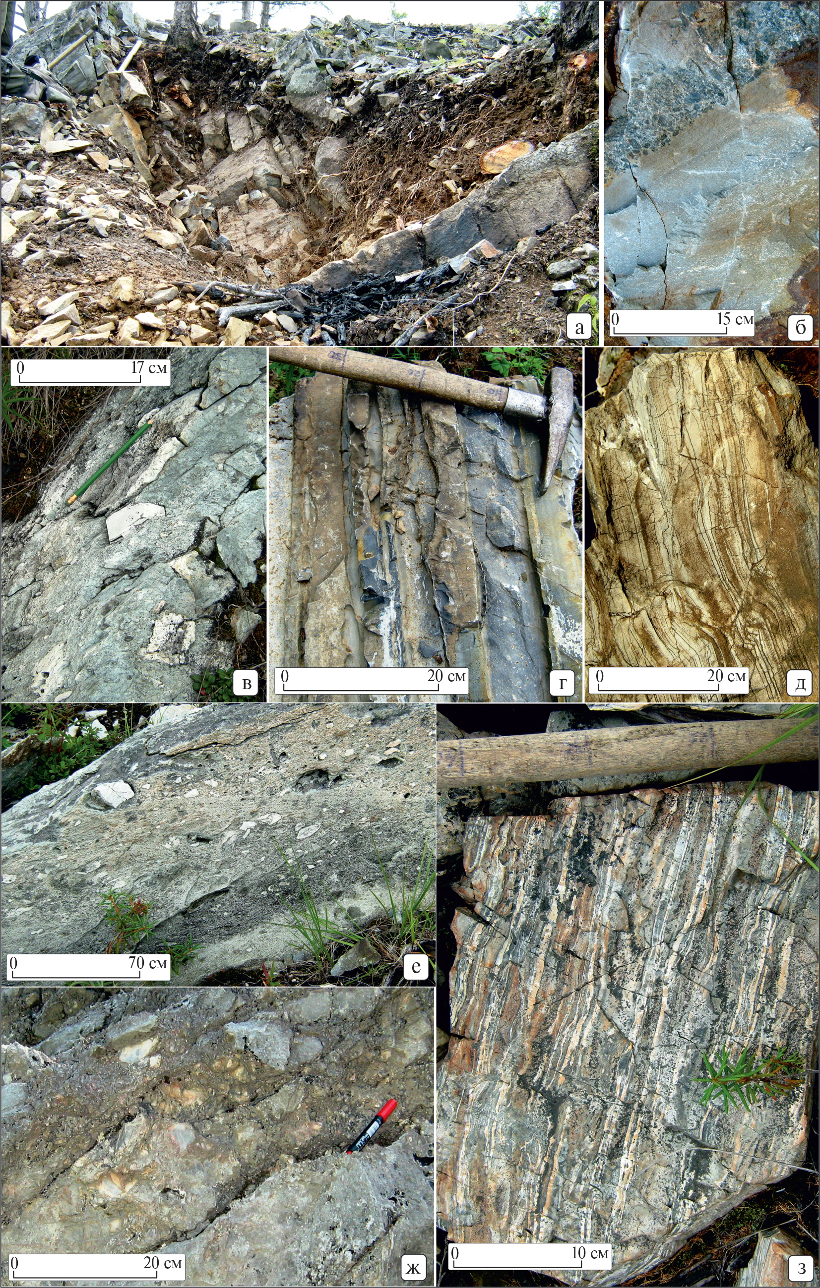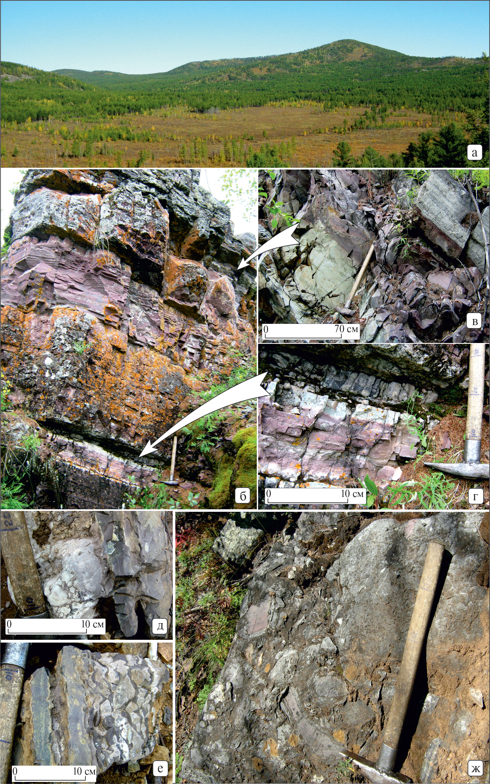 а – общий вид водораздела рек Ульзутуй–Известковый; б–г – фрагмент обнажения ульзутуйской толщи (б) и его детали (в, г): в – туффиты нежно-зеленого цвета с прослоями кремнистых туфов (слой 9), сменяющиеся темно-лиловыми туфоалевролитами и серыми зеленовато-серыми среднезернистыми туфопесчаниками, г – переслаивание лиловых известковистых туфоалевролитов, туфоаргиллитов и зеленовато-серых туфопесчаников (слой 5); д – буровато-вишневые алевритистые органогенно-обломочные известняки с прослоями известковистых алевролитов, обломками белого известняка с археоциатами (слой 8); е – алевритистые известняки, красновато-бурые, с характерными “петельчатыми” текстурами, прослоями туфоалевролитов с обломками мраморизованных известняков; ж – туфоконглобрекчия.