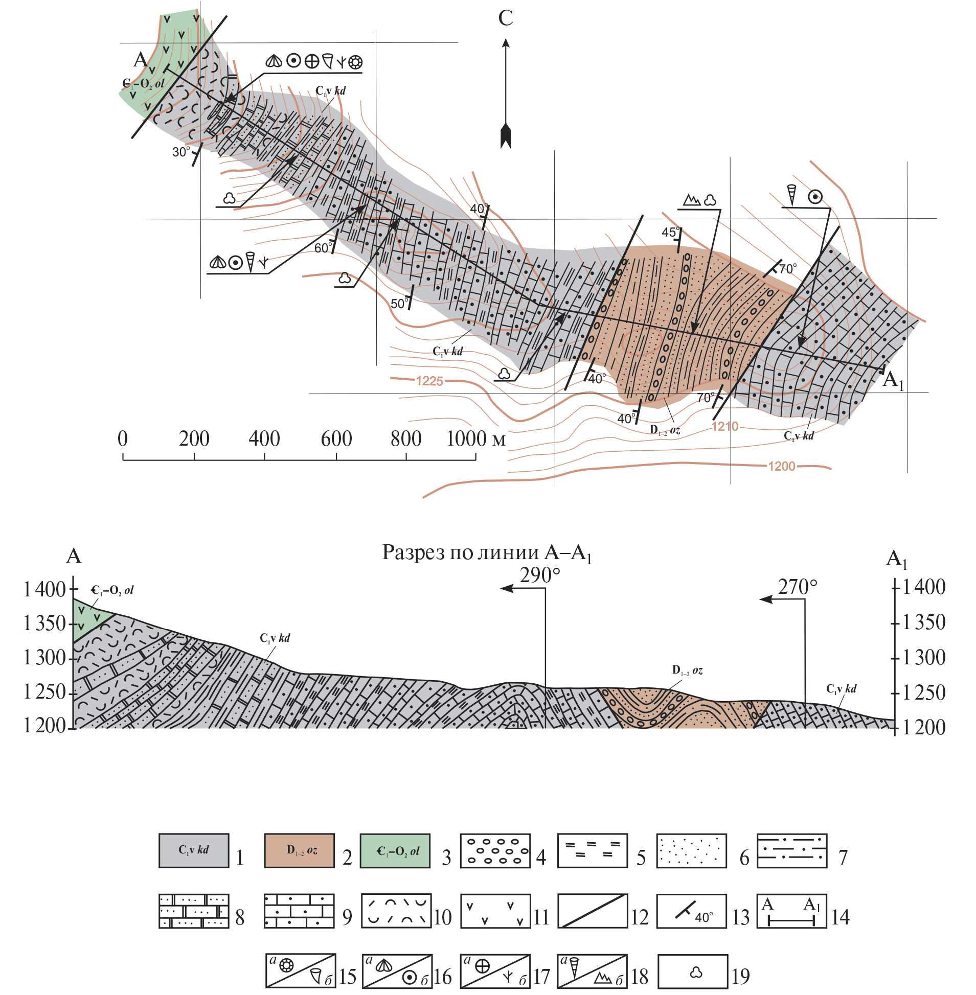 1 – кыджимитская толща (C1vkd); 2 – озернинская толща (D2–3oz); 3 – олдындинская свита (Є1–О2 ol); 4 – конгломераты; 5 – туффоаргиллиты, глинисто-кремнистые аргиллиты; 6 – полимиктовые песчаники с линзами гравелитов, карбонатных песчаников; 7 – алевролиты известковистые; 8 – известковистые песчаники; 9 – органогенно-обломочные, детритовые известняки; 10 – туффиты пепловые, кислого состава; 11 – андезиты; 12 – тектонические нарушения; 13 – элементы залегания; 14 – линия разреза; 15–19 – места находок органических остатков: 15 –археоциаты (а), трилобиты (б); 16 – брахиоподы (а), криноидеи (б); 17 – мшанки (а), водоросли (б); 18 – тентакулиты (а), конодонты (б); 19 – миоспоры.