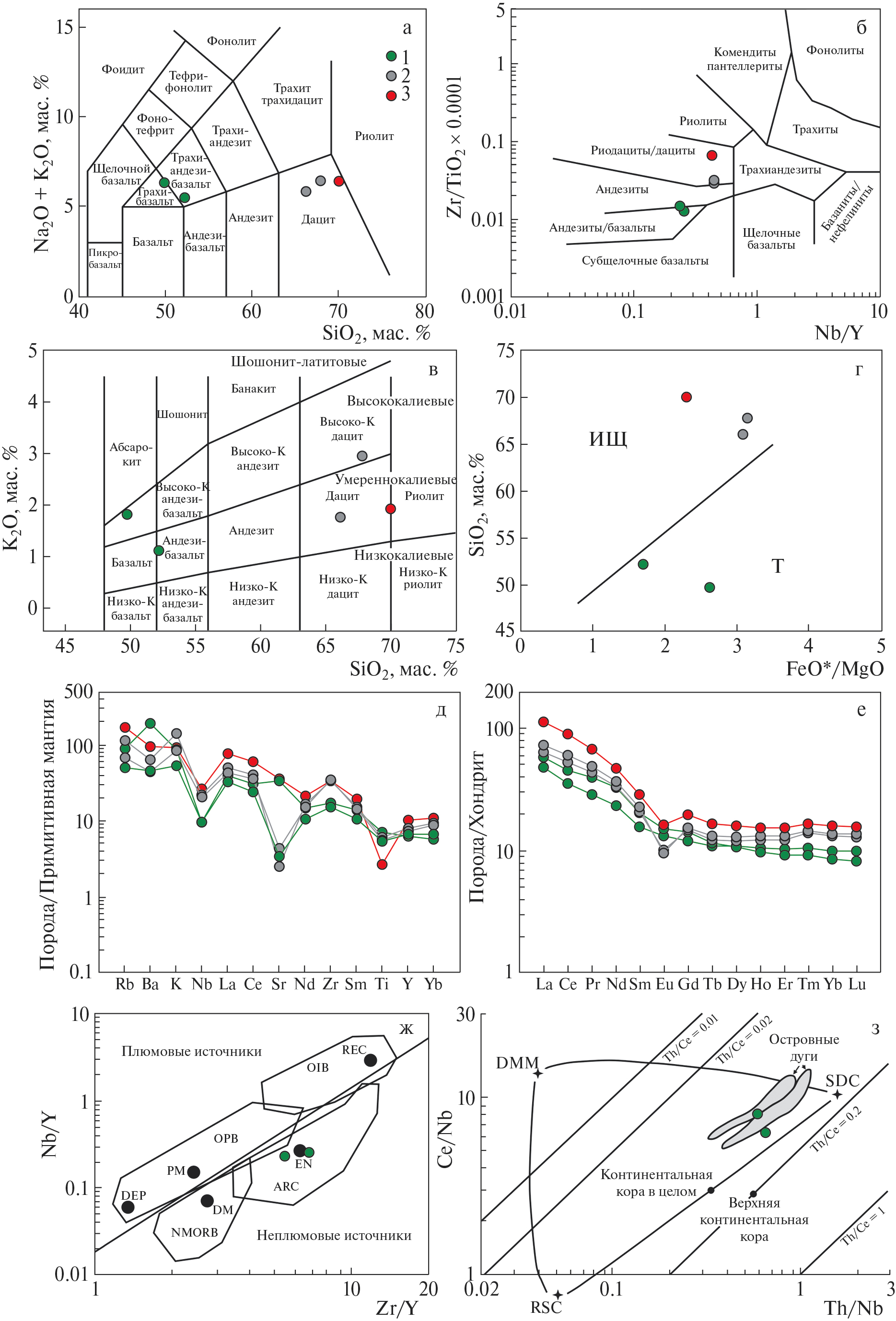 а ‒ Na2O + K2O – SiO2 [Le Maitre et al., 1989], модифицированная [Петрографический…, 2009]; б – Nb/Y–Zr/TiO2 [Winchester, Floyd, 1977]; в ‒ K2O–SiO2 [Taylor, McLennan, 1985]; г – SiO2–FeO*/MgO [Myashiro, 1974]; д – графики распределения содержаний микроэлементов, нормированных к примитивной мантии [Taylor, McLennan, 1985]; е – спектры распределения нормированных к хондриту [Taylor, McLennan, 1985] содержаний редкоземельных элементов, в породах кыджимитской толщи; ж – Zr/Y–Nb/Y [Condie et al., 2005]; з ‒ Th/Nb–Ce/Nb [Sanders et al., 1988].