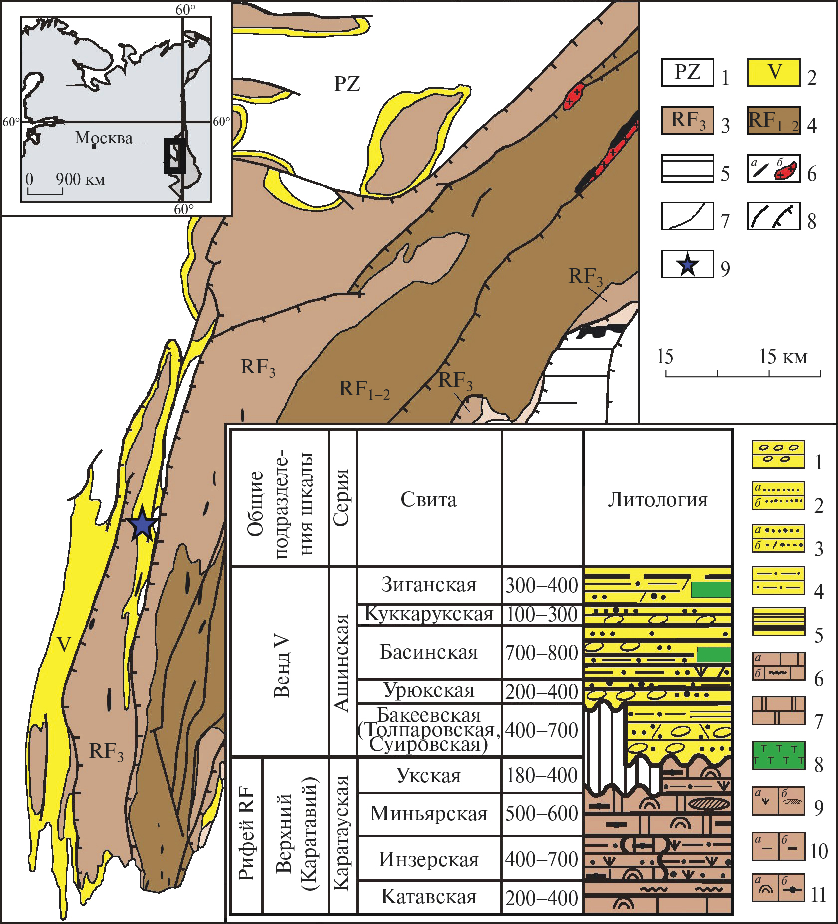Карта: 1–5 – нерасчлененные отложения: 1 – палеозоя (PZ), 2 – венда (V), 3 – верхнего рифея (RF3), 4 – нижнего и среднего (RF1–2), 5 – Уралтауский и Уфалейский метаморфические комплексы; 6 – магматические породы: габбро (а) и граниты (б); 7 – геологические границы; 8 – основные тектонические нарушения; 9 – местоположение толпаровского разреза урюкской свиты.