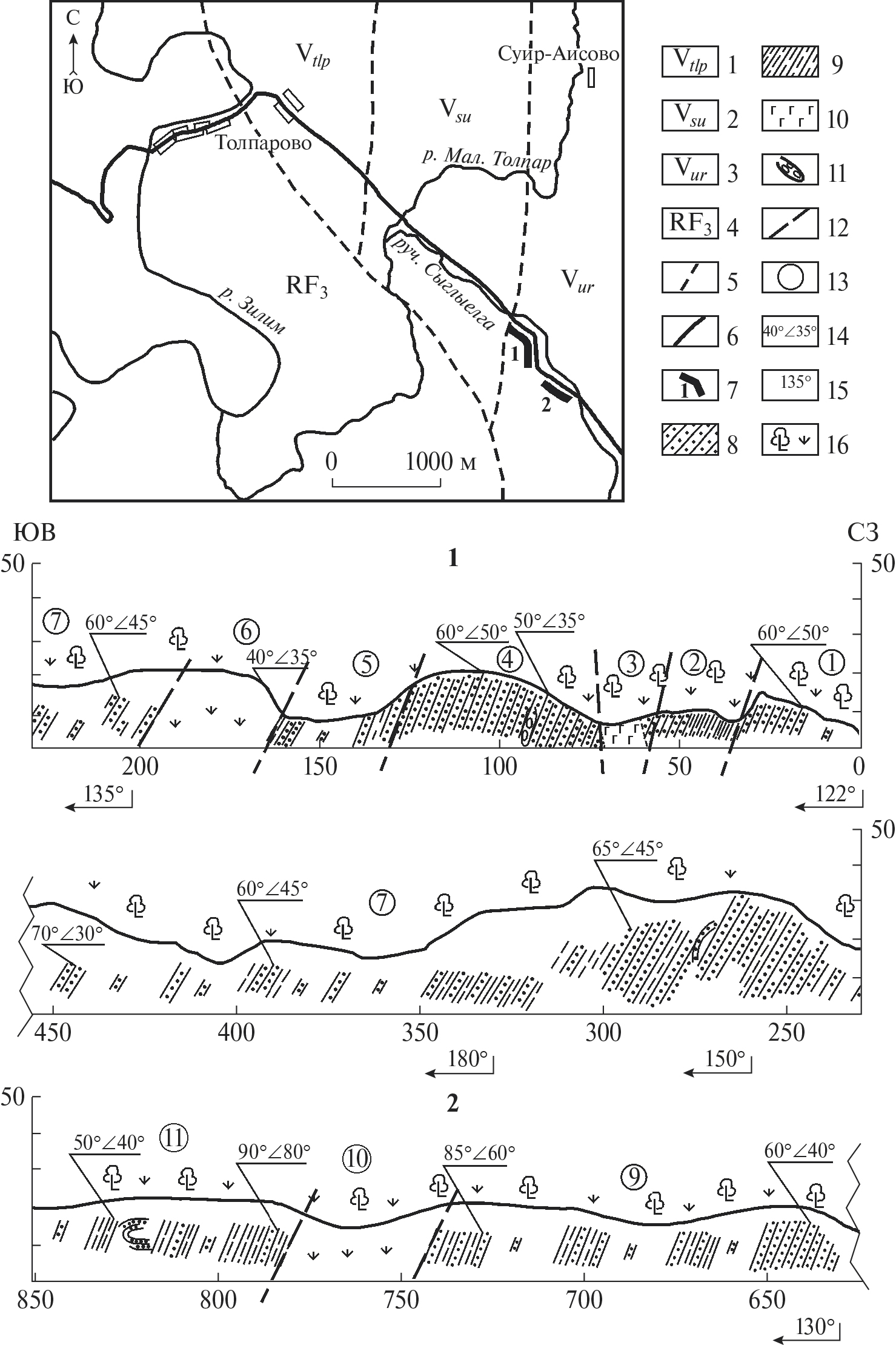 1–3 – отложения венда, свиты: 1 – толпаровская (Vtlp), 2 – суировская (Vsu), 3 – урюкская (Vur); 4 – нерасчлененные отложения верхнего рифея (RF3); 5 – геологические границы; 6 – автодорога; 7 – положение и номера фрагментов изученного разреза урюкской свиты; 8 – песчаники; 9 – аргиллиты и алевролиты; 10 – габбродолериты; 11 – гравелиты; 12 – границы слоев; 13 – номера слоев; 14 – элементы залегания пород; 15 – азимут маршрута; 16 – задернованные участки.