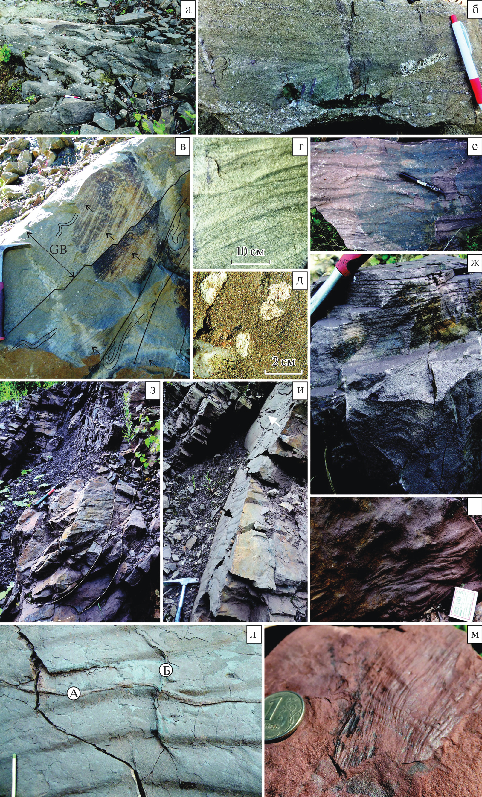 а–д – нижняя (сероцветная) толща: а – подводно-оползневая складка в песчаниках, б –песчаник с горизонтальной и косой слоистостью, в песчанике присутствует крупный литокласт гранито-гнейса, в – полого-наклонная косая слоистость в песчанике с тайдалитовой полосчатостью (стрелки) и складками оползания, г – косоволнистая слоистость в песчанике, д – гравийные включения кварца, литокласты полевого шпата и аргиллитов в песчанике; е–м – верхняя (красноцветная) толща: е – флазерная слоистость в мелкозернистом красноцветном песчанике, ж – контакт песчаника с отчетливо выраженной слоистостью приливно-отливного типа (сверху) с массивным несортированным разнозернистым песчаником (снизу), з – подводно-оползневая складка в песчано-глинистой толще, и – знаки ряби (черная стрелка) и валообразная структура (белая стрелка) на поверхности напластования песчаников, к – механоглифы – следы механического воздействия, размыва или оплывания вследствие нагрузки на полужидкий осадок, л – валики в виде слабо извилистых шнуров (следы стекания и разрыва сплошности), выполненных грубым песком, на “глянцевой” глинистой поверхности напластования со знаками ряби (А – вдоль хребтика ряби, Б – укороченная разновидность, перпендикулярно секущая знаки ряби); м – арумбериеморфный(?) отпечаток на поверхности песчаника.