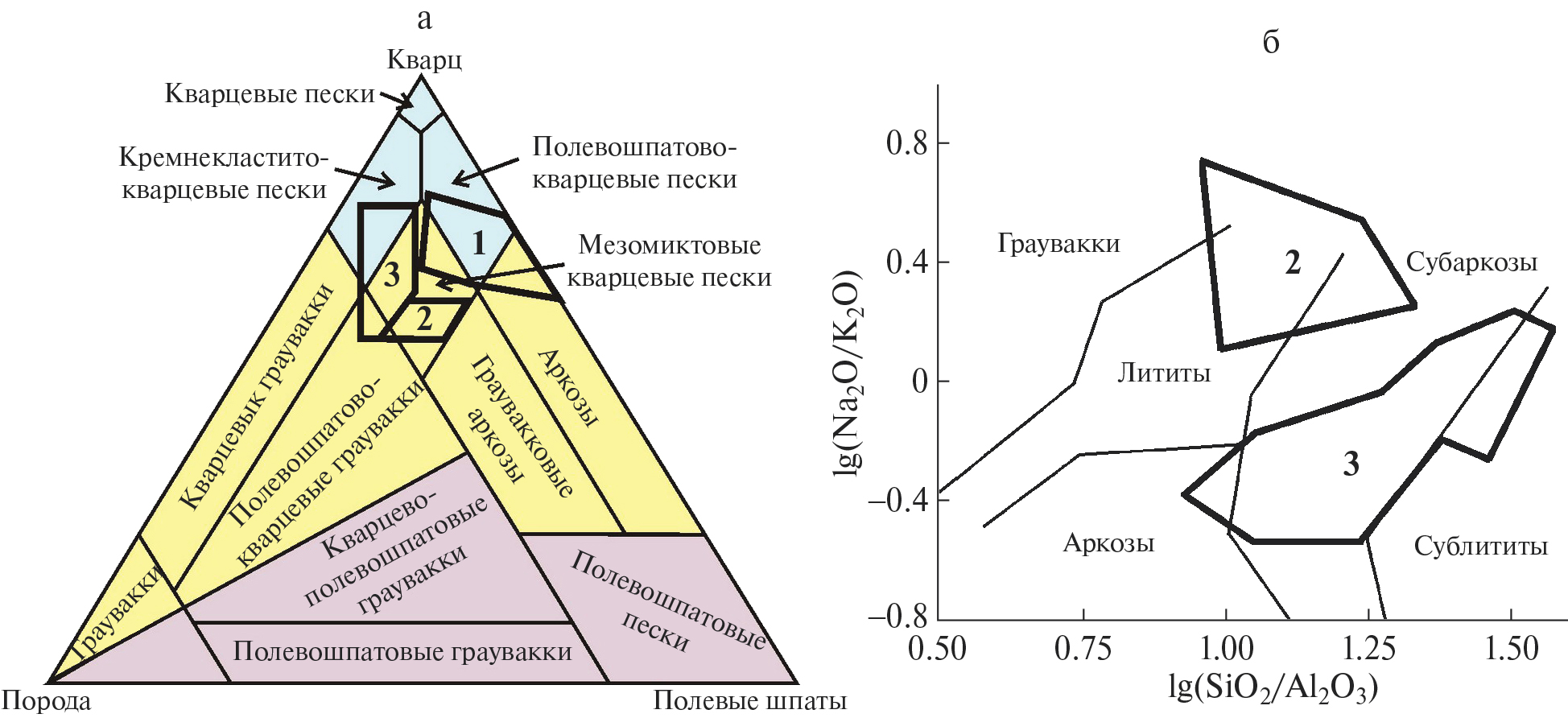 Рис. 5. Положение полей составов песчаников урюкской свиты на классификационных диаграммах В. Д. Шутова [1967] (а) и Ф. Петтиджона с соавторами [Pettijohn et al., 1987] (б)