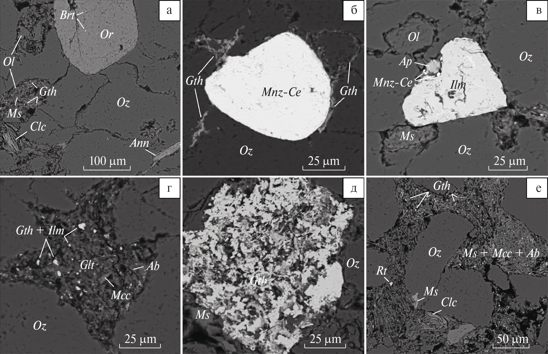 а – окатанные зерна ортоклаза и олигоклаза, обломочный аннит, в ортоклазе присутствуют включения барита; олигоклаз замещается мусковитом и клинохлором; б – полуокатанное зерно монацита (Се), цемент выполнен гидроксидами железа (гетит); в – полуокатанные зерна ильменита, олигоклаза, фторапатита, монацита-(Се), олигоклаз замещается мусковитом; г – глауконит в цементе песчаника, альбит и микроклин, образованные in situ, гетит развивается по ильмениту; д – гетит, заместивший ильменит(?); е – мусковит, клинохлор, микроклин, альбит, гетит, рутил в поровом пространстве.