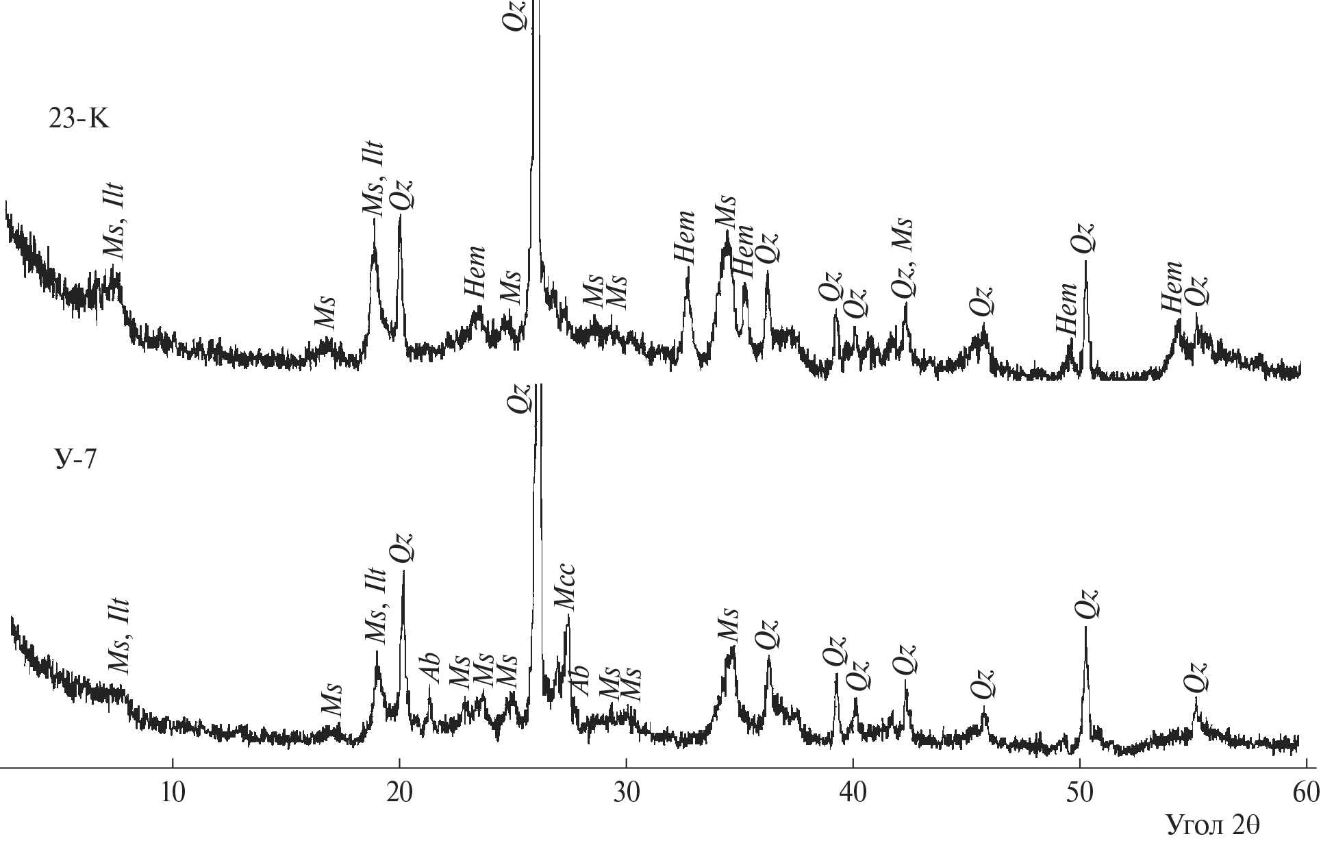 Сокращения: Ab – альбит; Hem – гематит; Ilt – иллит; Mcc – микроклин; Ms – мусковит; Qz – кварц.