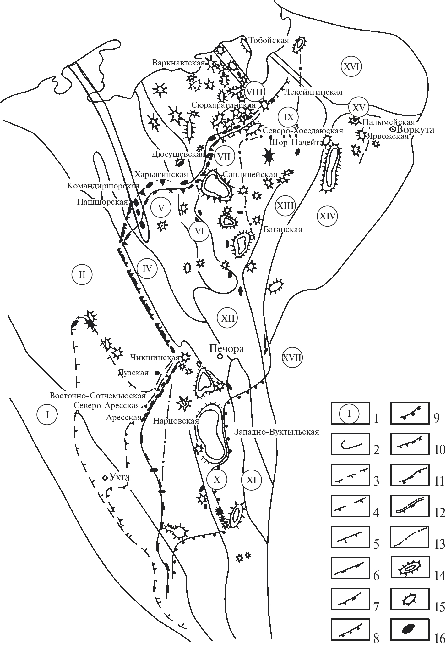 1 – крупные тектонические элементы (римские цифры на схеме): I – Тиманский кряж; Печорская плита: II – Ижма-Печорская впадина, III–Малоземельская моноклиналь, IV – Печоро-Колвинский мегавал, V – Денисовская впадина, VI – Колвинский мегавал, VII–Хорейверская впадина, VIII – Варандей-Адзьвинская структурная зона, IX – вал Гамбурцева; Северо-Уральский краевой прогиб: X – Верхнепечорская впадина, XI–Среднепечорское поднятие, XII – Большесынинская впадина, XIII – гряда Чернышова, XIV – Косью-Роговская впадина, XV – гряда Чернова, XVI – Коротаихинская впадина, XVII – западный склон Урала; 2 – границы тектонических зон; разновозрастные рифогенные зоны: 3 – доманиковые, 4 – сирачойско–нижнеухтинские, 5 – доманиково-нижнеухтинские, 6 – верхнеухтинские, 7 – верхнефранские, 8 – нижнефаменские, 9 ‒ нижне-верхнефаменские, 10 ‒ доманиково-верхнефаменские, 11 ‒ верхнефранско-нижнефаменские, 12 – сочетание разнотипных банок с краевыми рифогенными образованиями, 13 – склоны фаменских клиноформ, 14 – изолированные банки с рифовым окаймлением внутри компенсированных впадин, 15 – одиночные рифы, 16 – залежи нефти.
