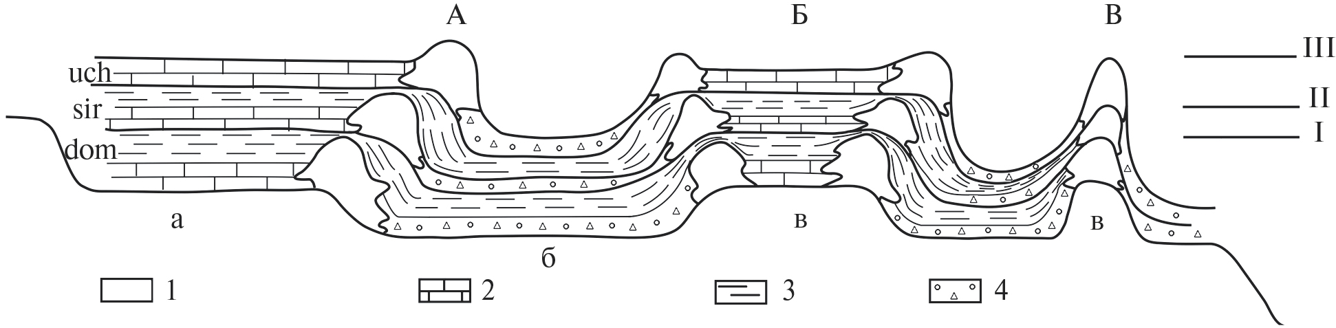 а – мелководная часть шельфа, б – глубоководная впадина, в – отмели; морфологические типы рифовых сооружений: А – асимметричные рифовые системы, Б – атолловидные сооружения, В – одиночные рифы; циклы рифообразования: dom – доманиковый, sir – сирачойский, uch – ухтинский; уровни моря: I – доманикового, II – сирачойского, III – ухтинского времени; 1 – рифовые тела, 2 – карбонатные отложения, 3 – карбонатно-глинистые отложения, 4 – кремнисто-глинисто-карбонатные отложения.