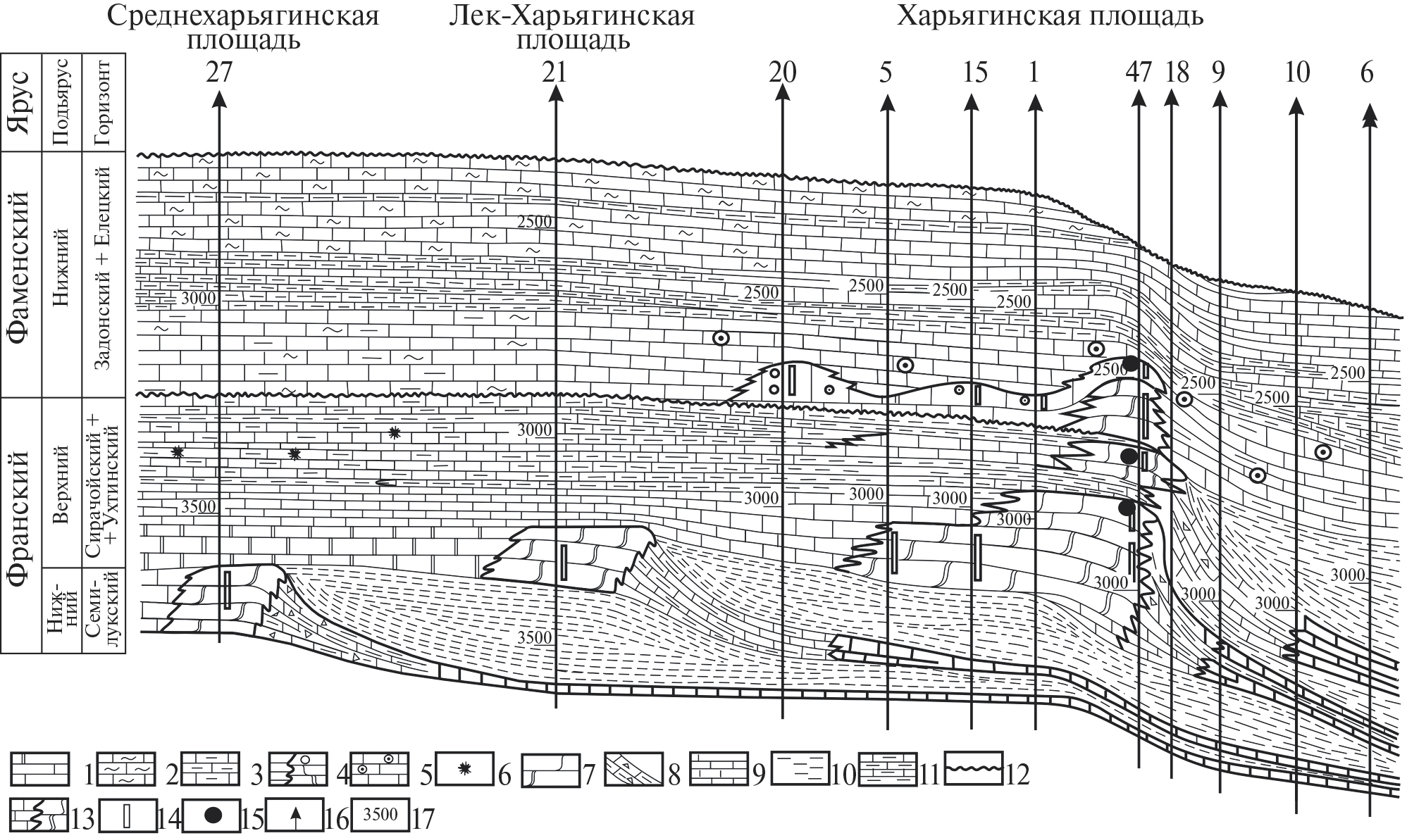 1–5 – мелководно-шельфовая зона: 1 – карбонатные толщи, 2 – узловатые известняки, 3 – карбонатно-глинистые толщи и пачки, 4 – банки интракластовых известняков, 5 – онколитовые известняки; 6 – красноцветность; 7 – рифогенные образования; 8 – отложения предрифового склона; 9 – отложения депрессионных фаций; 10, 11 – толщи заполнения: 10 – глинистые, 11 – карбонатно-глинистые; 12 – поверхности размывов и стратиграфических перерывов; 13 – зоны резких литофациальных замещений; 14 – интервалы коллекторов; 15 – залежи нефти; 16 – разрезы скважин; 17 – глубина по скважине, м.