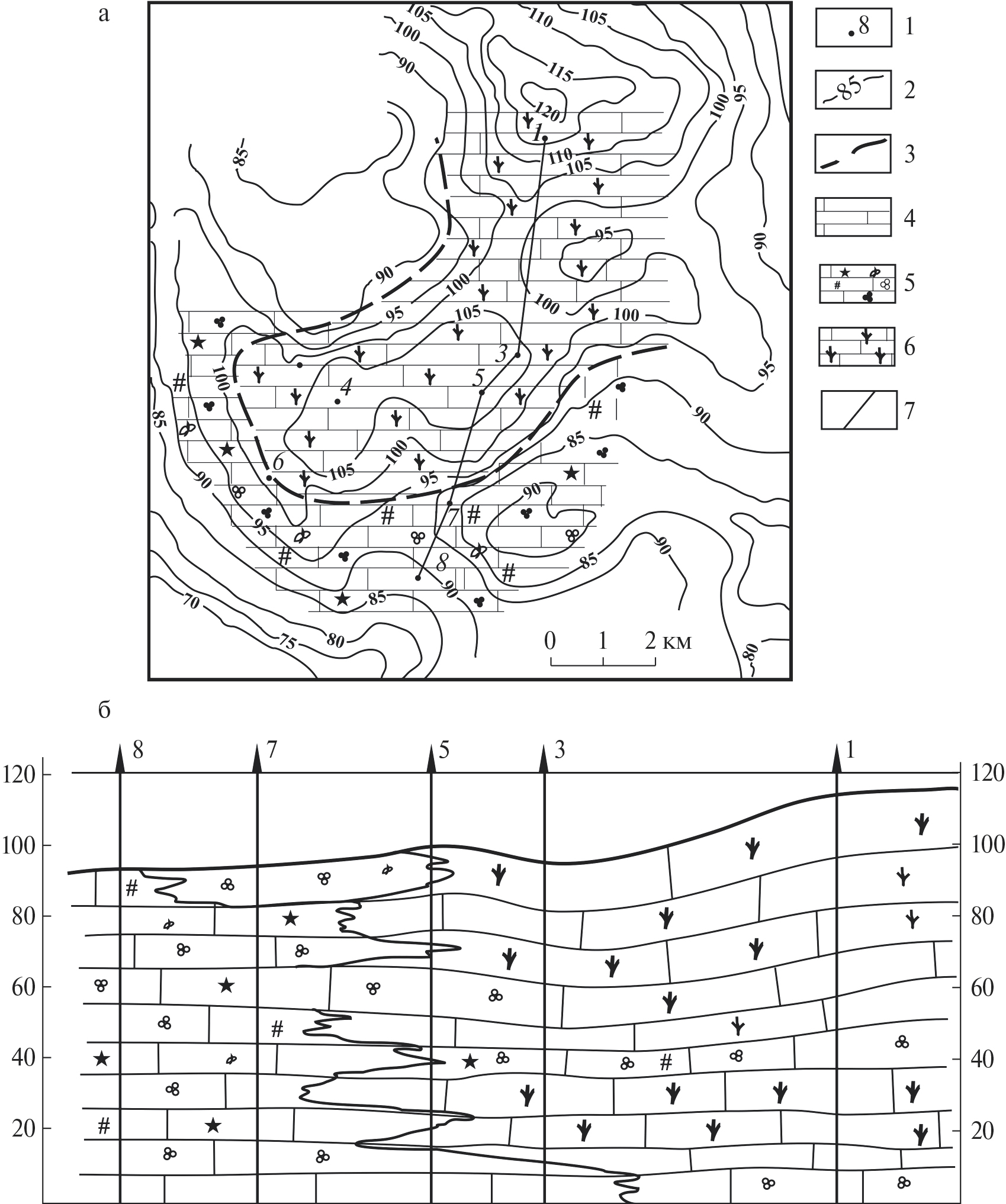 1 – скважины, 2 – изогипсы мощности ассельско-сакмарских отложений, 3 – граница фациальных зон, 4 – известняки микрозернистые с органогенным детритом, 5 – известняки биокластовые с яснокристаллическим кальцитовым цементом, микрозернистые с органогенным детритом, 6 – известняки биогермные, 7 – линия профильного разреза.