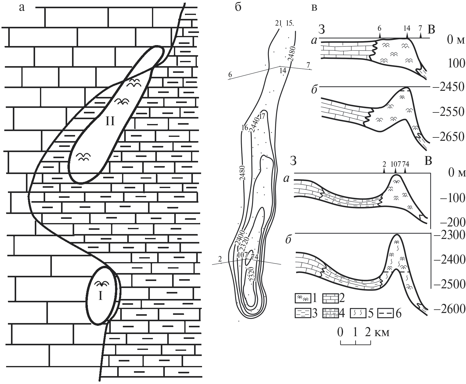 в – палеогеоморфологическое положение относительно уровня моря (а) и современное положение (б); 1 – рифы, 2 – мелководные известняки, 3 – глины, 4 – глинисто-карбонатные депрессионные отложения, 5 – трещиноватость, 6 – водонефтяной контакт.