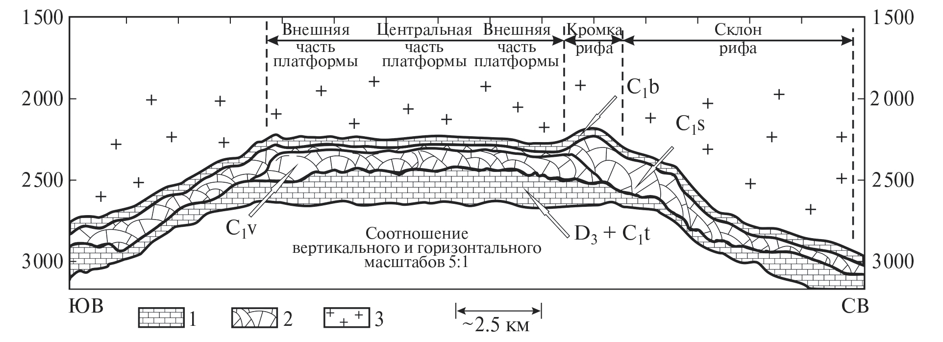 1 – нерифовые известняки; 2 – рифовое сооружение; 3 – соленосная толща.