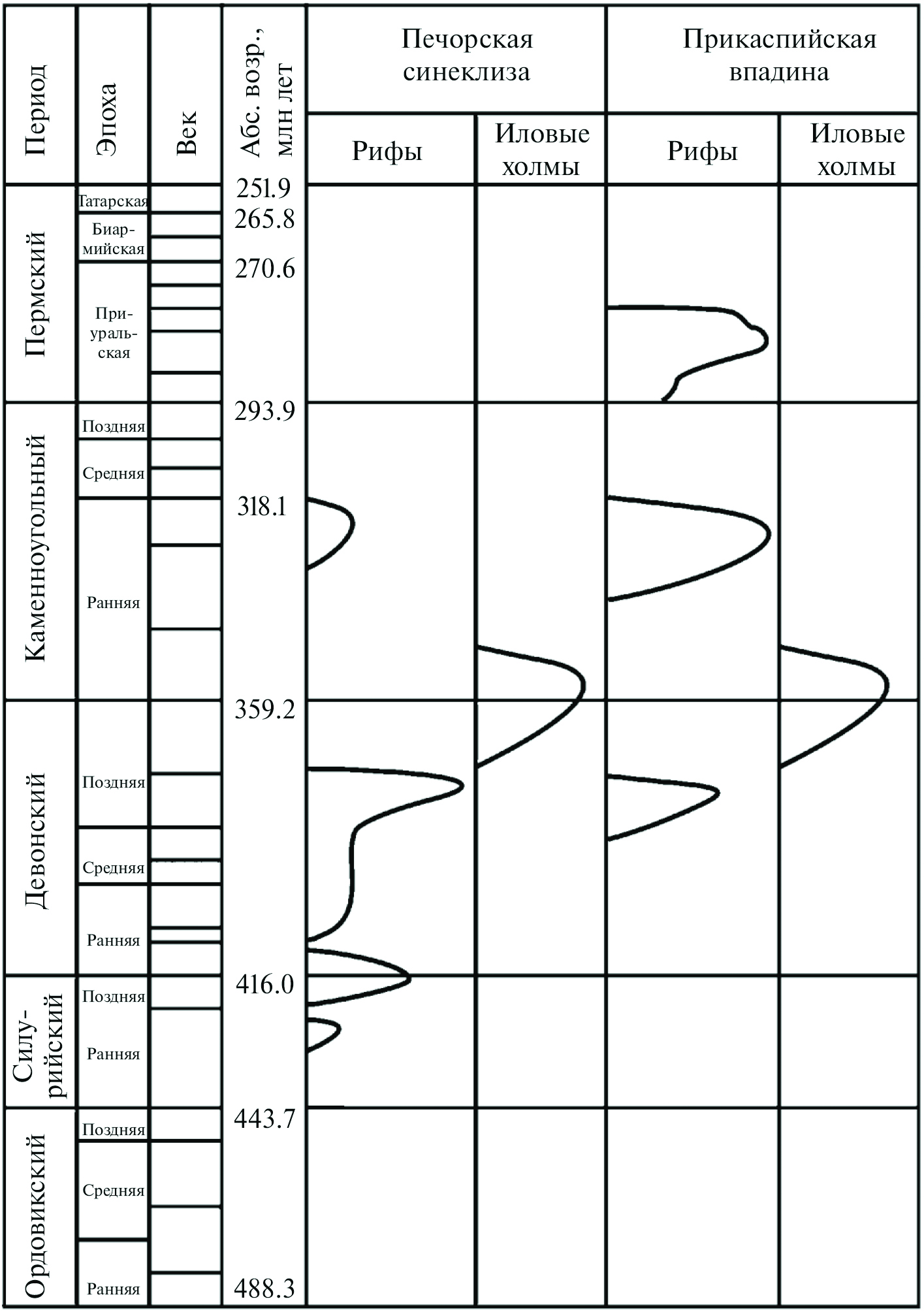 Рис. 7. Стратиграфическое распределение рифов и иловых холмов Печорской синеклизы и Прикаспийской впадины