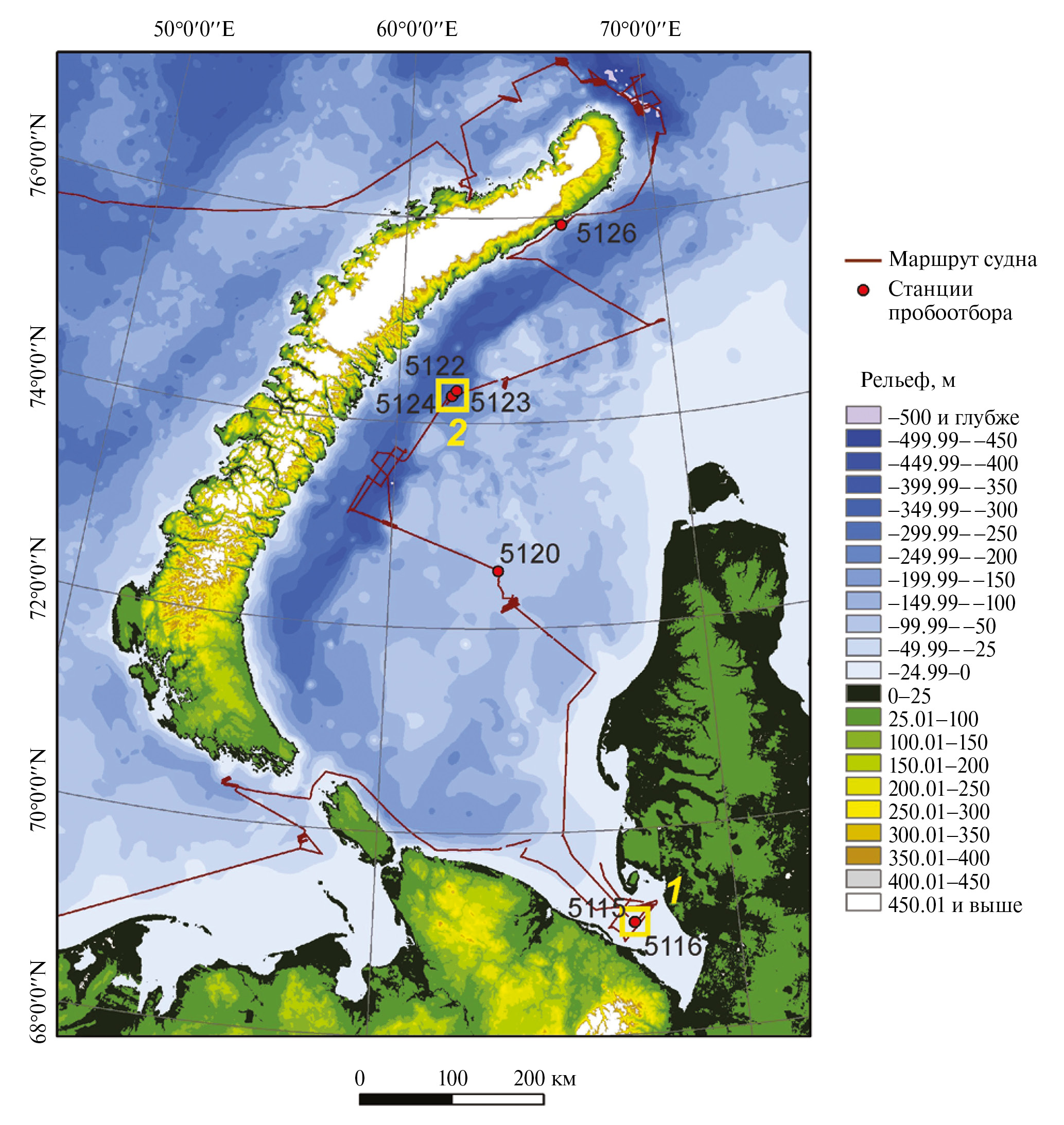 2. Fig. 1. Route of the 51st cruise of the R/V Academician Boris Petrov and the position of the sampling stations considered in the article. The relief is shown according to the IBCAO version 3 data. Yellow squares are the positions of detailed bathymetric survey polygons presented in Fig. 2a (1) and 2c (2)
