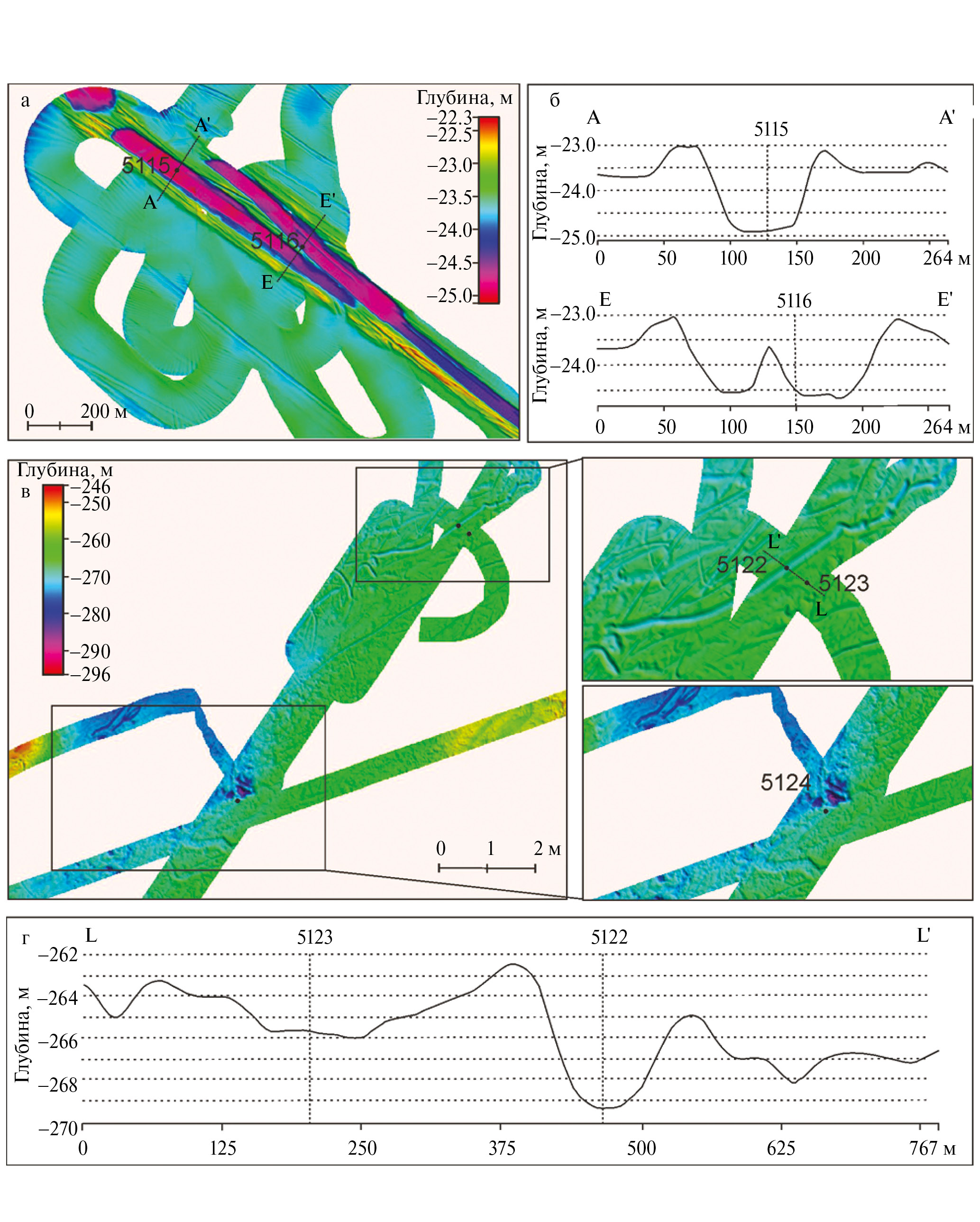 По данным акустической съемки были выбраны борозды выпахивания на мелководье (интервал глубин 23–25 м) в осевой части Байдарацкой губы (см. рис. 1, рис. 2а, 2б) и ледово-экзарационные формы в Восточно-Новоземельском желобе на глубине 260–270 м, представляющиеся реликтовыми образованиями (см. рис. 1, 2в, 2г). Колонка 5120 отобрана в борозде (интервал глубин 48– 49.5 м), расположенной к северо-западу от месторождения Ленинградское. Выход керна при пробоотборе составил всего 12 см.