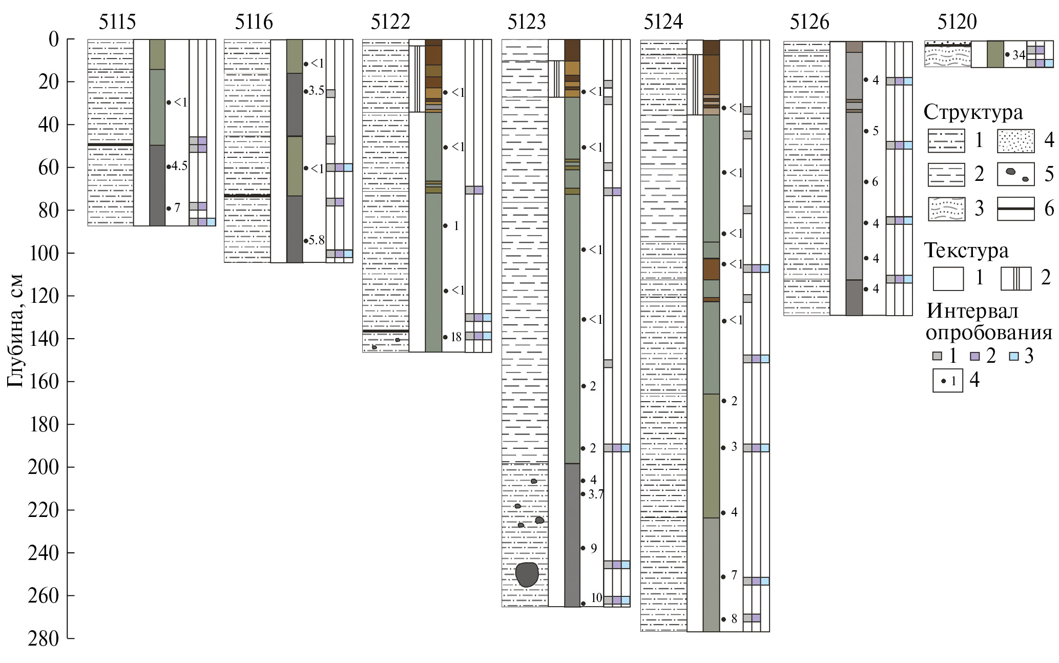 Рис. 3. Литологические колонки, отобранные в экзарационных бороздах (5115, 5116, 5120, 5122) и на фоновой поверхности (5123, 5124, 5126).