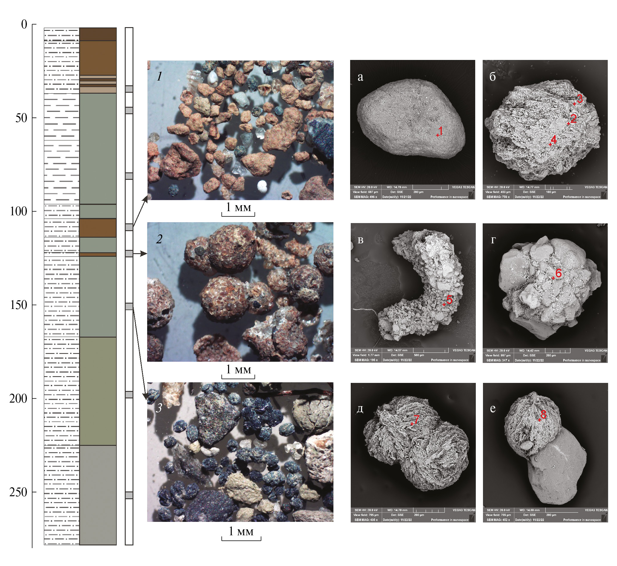 а–е – сканирующая электронная микроскопия отдельных зерен из соответствующих интервалов. Данные об атомарном процентном содержании элементов в точках сканирования, обозначенных на фотографиях красным шрифтом, представлены в табл. 2. Условные обозначения структур см. рис. 3