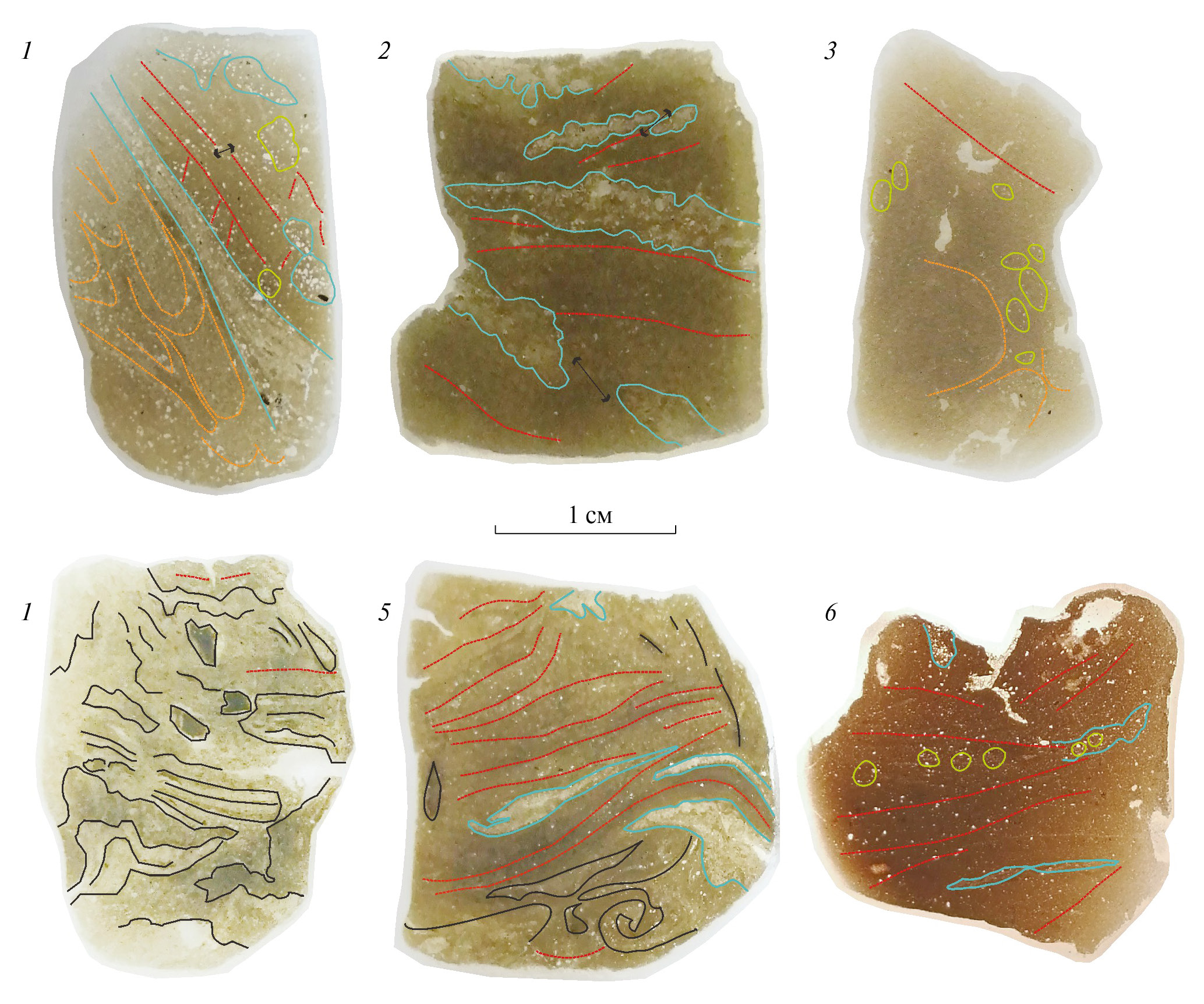 6. Fig. 5. Micromorphology of sediment samples collected in the axial (column 5115) and instrumental (column 5116) parts of the ice-excavation furrow in Baidarata Bay. Intervals for petrographic sections, column 5115: 1 - 49-52 cm, 2 - 77-79 cm, 3 - 86-90 cm; column 5116: 4 - 57-62 cm, 5 - 73-77 cm, 6 - 98-100 cm. The following structural-textural features are marked by color: red dotted line - line of orientation of linear arrangement of mineral grains, orange dotted line - line of arc-shaped orientation of mineral grains, yellow - circular orientation of mineral grains (rotational structure), blue - lenses of coarse-grained sandy material, black - zones of staining with fine-dispersed organic matter. Arrows indicate microfracture discontinuities