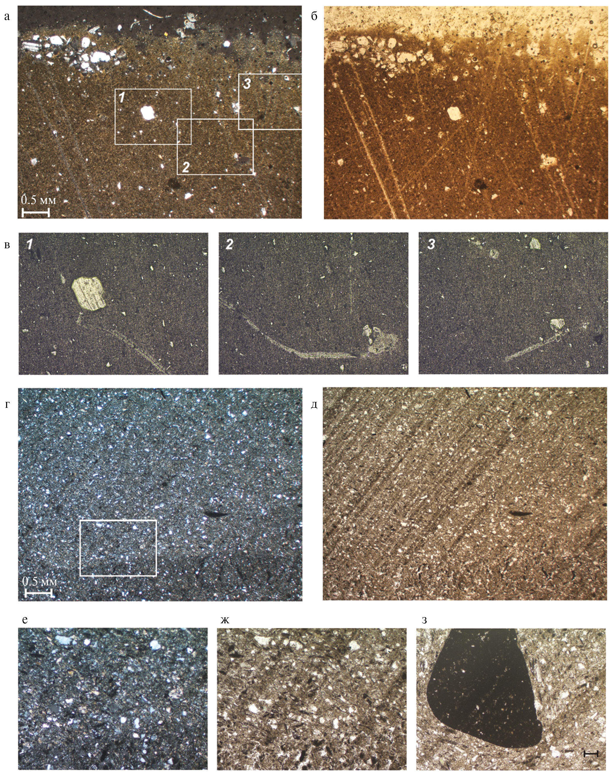 Рис. 6. Явление микроштриховки в образце 5124_198: петрографический шлиф, проходящий свет с анализатором (а) и без анализатора (б), отраженный свет, квадраты 1, 2, 3 (в); в образце 5126_86: петрографический шлиф проходящий свет с анализатором (г, е) и без анализатора (д, ж, з); е, ж – увеличенный фрагмент, выделенного участка