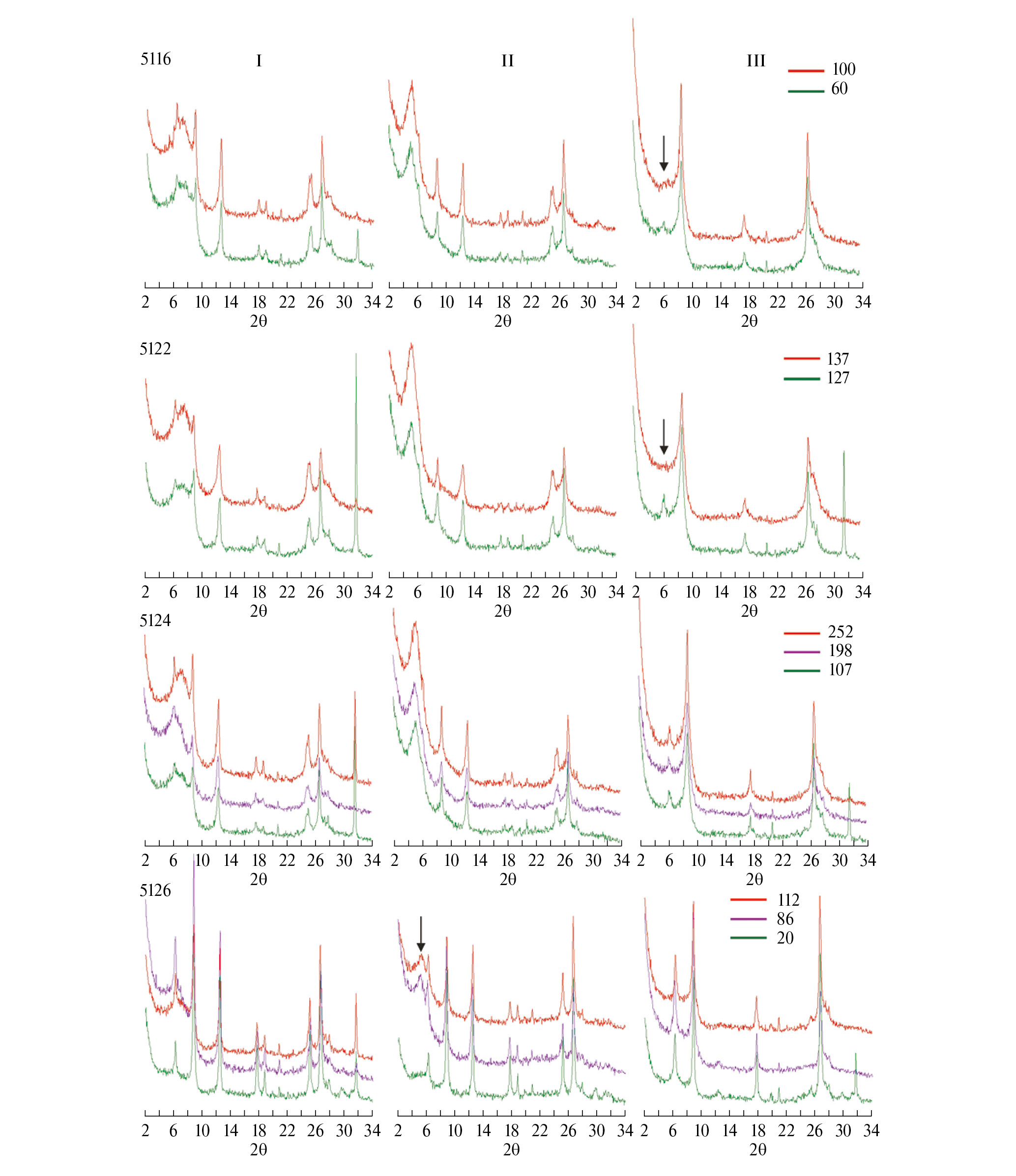 8. Fig. 7. X-ray diffractometric express imaging data of fine preparations in three states: I - air-dry (natural), II - saturated with ethylene glycol, III - calcined at T = 550°C. Line color: red - preparations are made of material at the bottom of the column with high shear strength, green - material at the top of the column with low shear strength, violet - material from areas with pronounced microhatching. The black arrow indicates the absence of chlorite peak on ignition in samples below the boundary of the supposed exaratation in columns from exaratation furrows (5122, 5116). 5124, 5126 are background columns. The black arrow for column 5126 marks the appearance of smectite peak at ethylene glycol saturation in the lower samples and its absence in the upper one