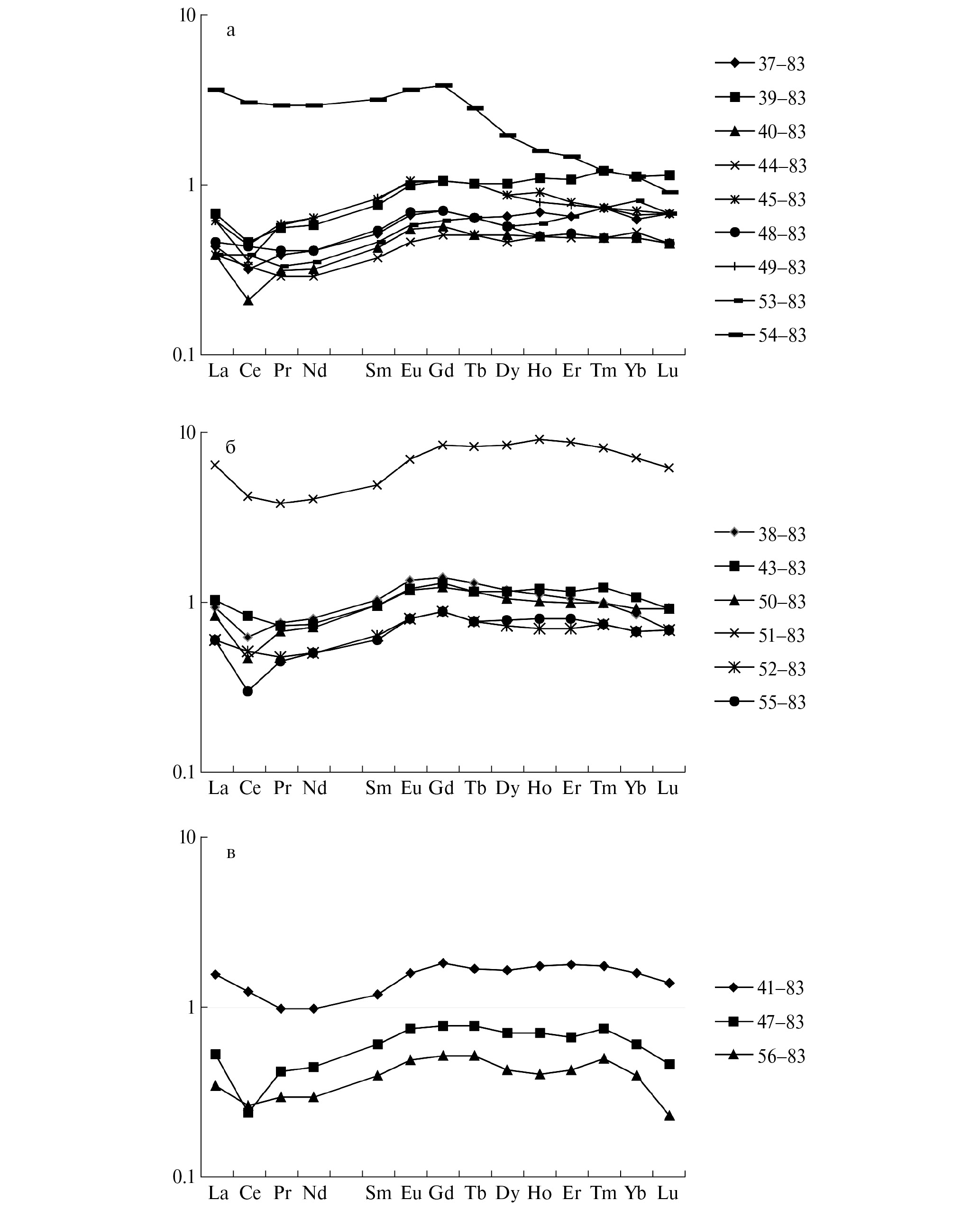 Образцы для анализа РЗЭ на ICP-MS готовили спеканием с карбонатом натрия. Для этого 0.1 г образца смешивали с 0.3 г безводного карбоната натрия (Merck, Suprapur торговый знак) в агатовой ступке и переносили в корундовый тигель. Спекание проводили при 800°C в течение часа в муфельной печи. Полученные таблетки обрабатывали 5 мл смеси HNO3 : HCl : HF 10 : 2 : 1 и после растворения объем раствора был доведен до 50 мл добавлением деионизированной воды (EasyPure®). Для измерения раствор разбавляли 3%-ной азотной кислотой. Метод спекания протестирован и сопоставлен с многокислотным микроволновым разложением нескольких стандартных образцов, включая донные отложения и марганцевые конкреции [Бычкова и др., 2020]. Оба метода показали хорошую сходимость результатов, но спекание предпочтительнее для пород с магнетитом, гематитом и минералами марганца.