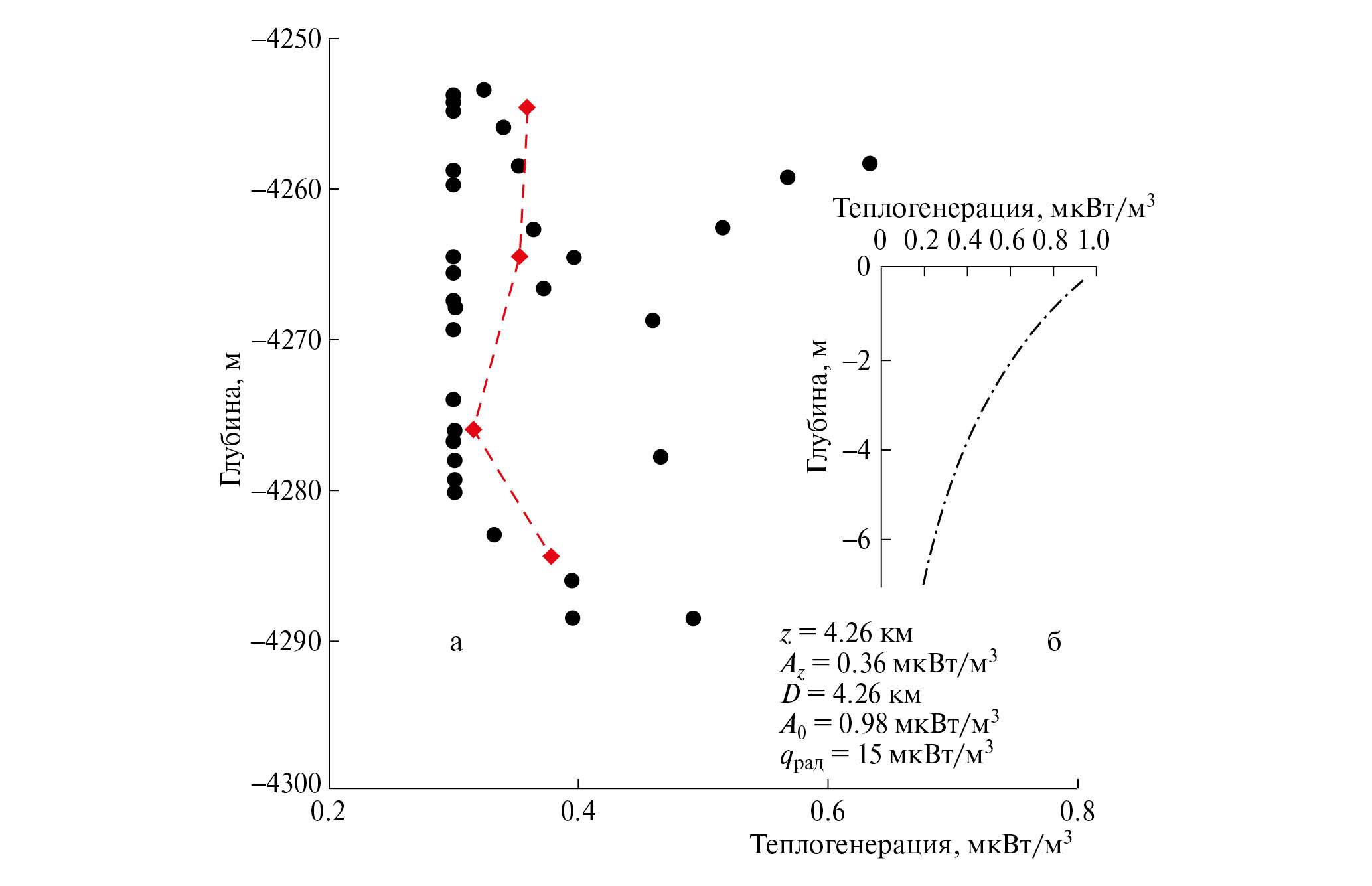 Для каждого профиля при моделировании задается значение краевой температуры на верхней границе (как правило, на подошве гелиотермозоны) в соответствии с метеорологическими данными, и редуцированный тепловой поток – на нижней границе (qред.), соответствующий его измерениям в ближайших скважинах (qнабл.) за вычетом теплового потока, генерируемого в вышележащем слое земной коры при спонтанном распаде долгоживущих радиоизотопов (qр.), т. е. qред. = qнабл. − qрад.
