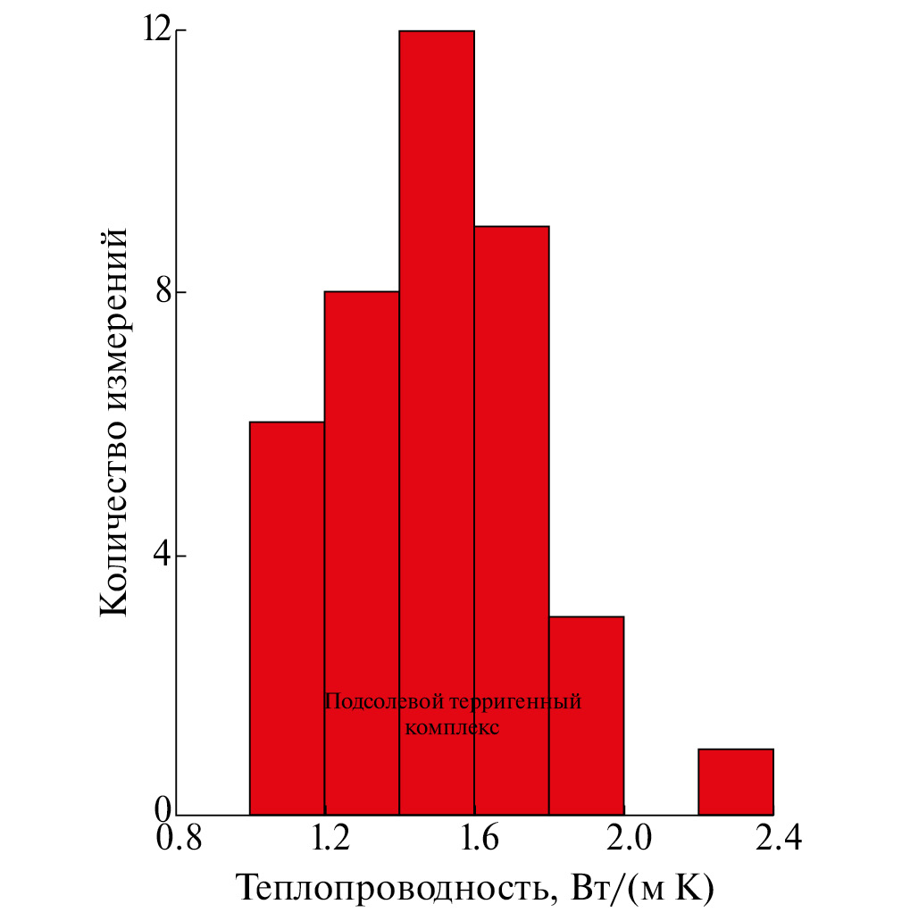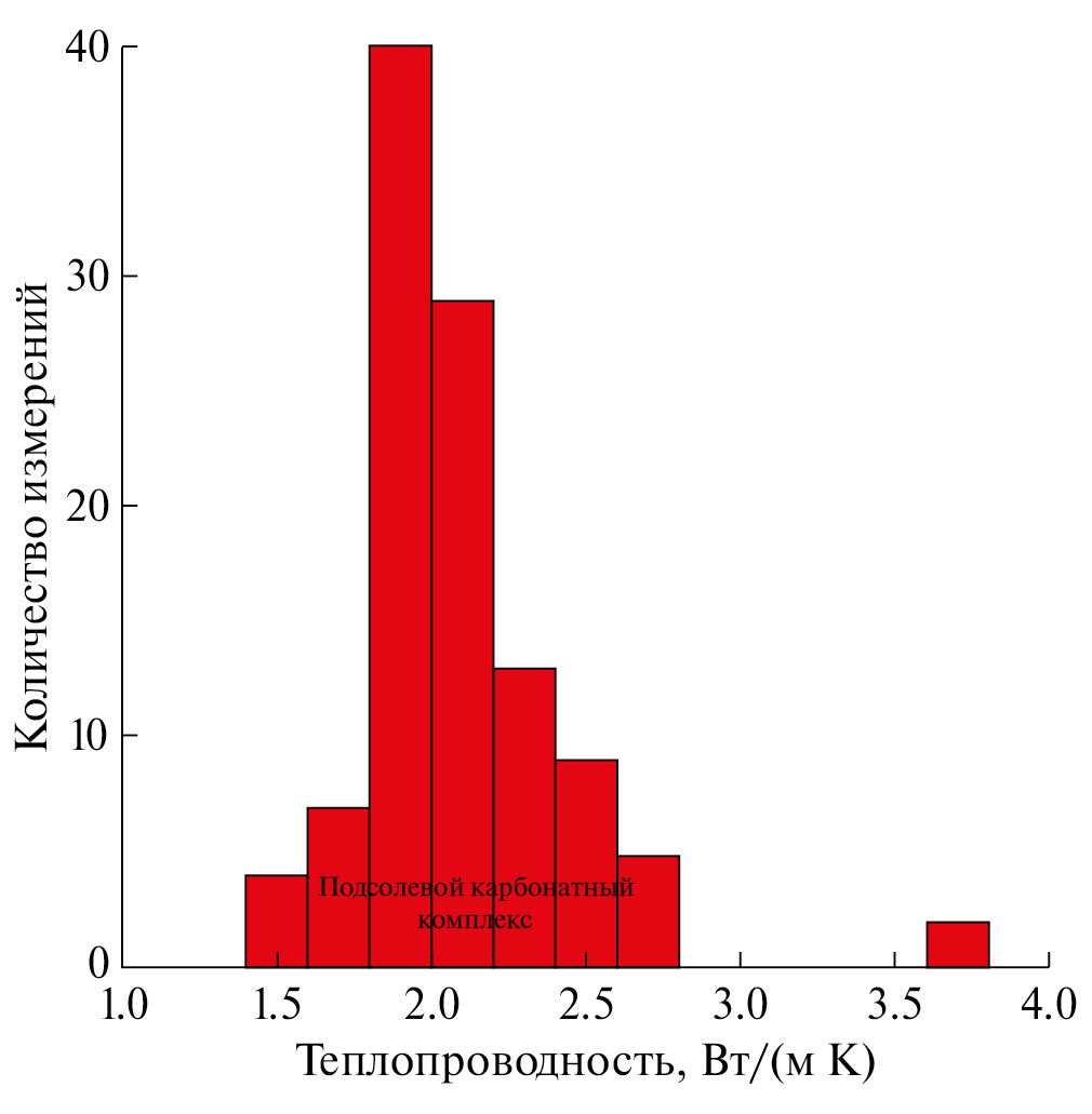 Важным параметром для геотермической характеристики региона и для проведения моделирования теплового поля является значение коэффициента теплопроводности пород разреза. В солянокупольных бассейнах основными контрастными комплексами являются эвапориты (соль, гипс, ангидрит), обладающие высокой теплопроводностью (от 3.0 – для ангидритов до 5.3 Вт/(м∙К) – для галита), и вмещающий терригенно-карбонатный комплекс с относительно низкой теплопроводностью. Нами проведены измерения теплопроводности пород этого комплекса по образцам керна из подсолевого разреза скважин Астраханского свода. Измерения проводились методом оптического сканирования на установке ТС14, сконструированной в ГИН РАН [Никитин и др., 2016].