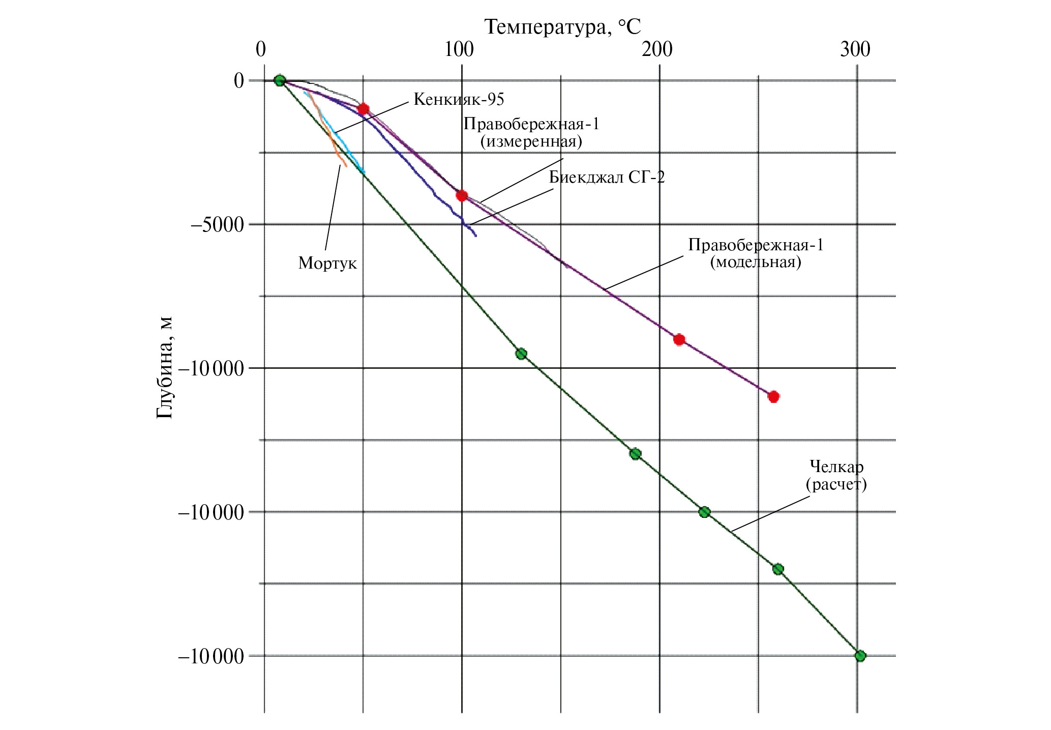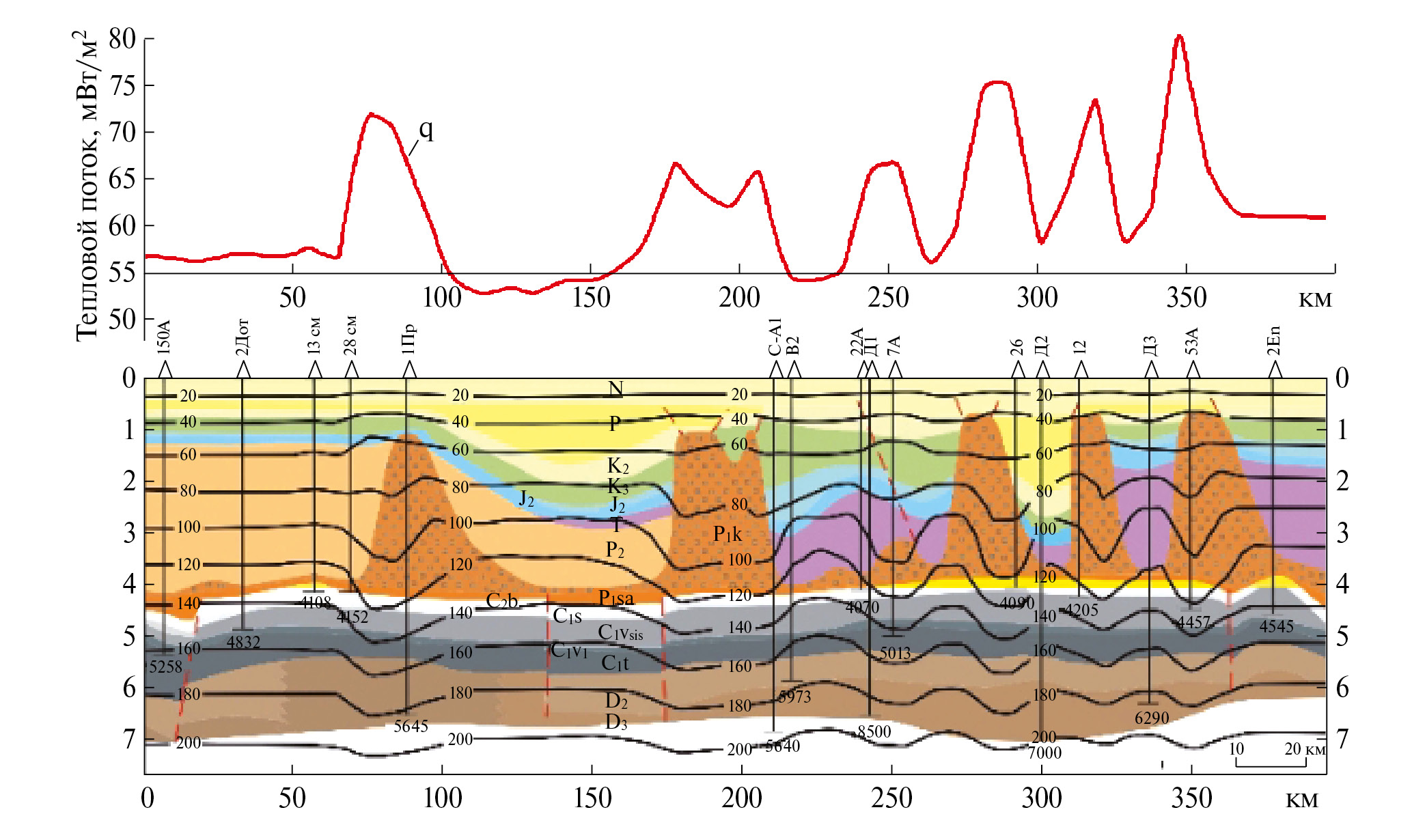 Глубинный диапазон для построения термической модели составлял 8 км, хотя максимальная глубина скважин, в которых измерена температура, составляла 6500 м, 1.5 км разреза ниже забоя скважин не имеют внутри этого интервала контрастных теплофизических слоев, что позволяет экстраполировать температурные условия в нижнее полупространство.