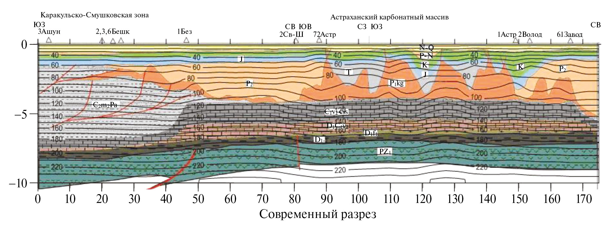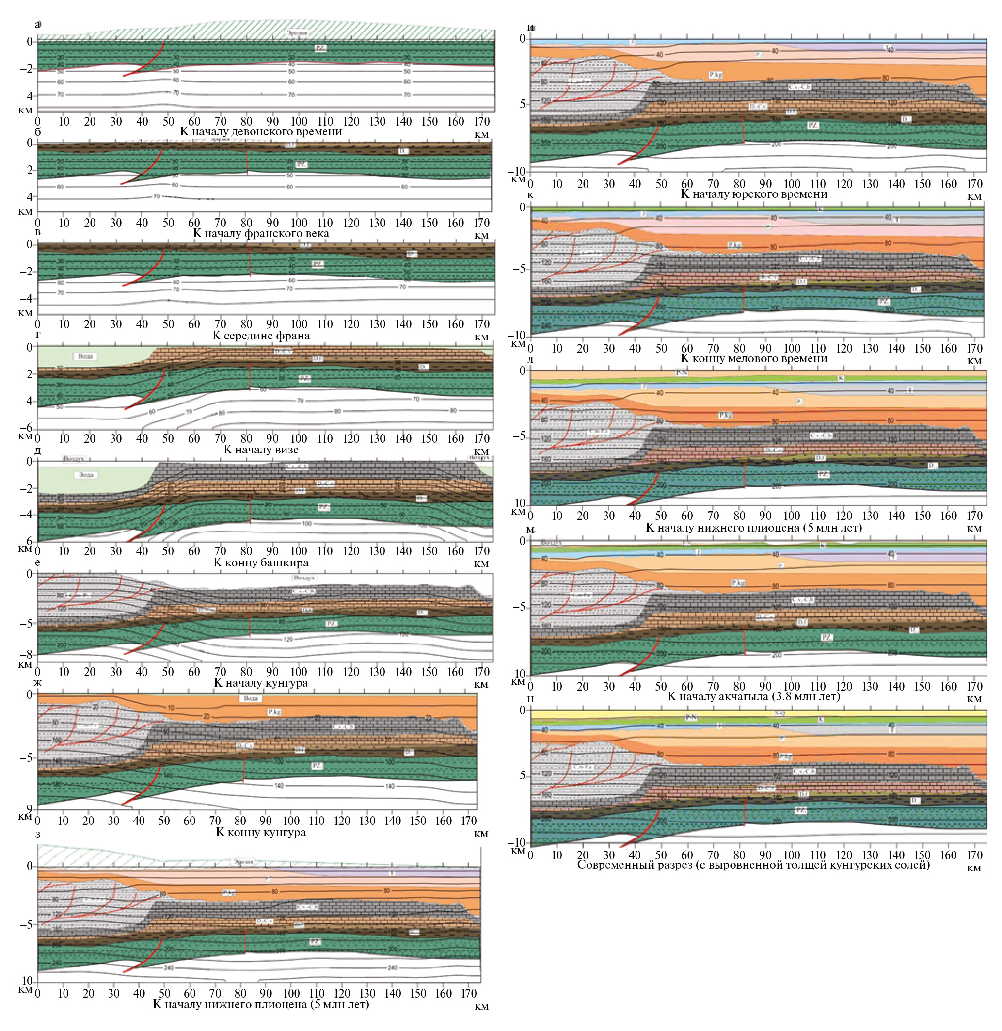 “Реперные” точки были привязаны к следующим этапам геологической истории: 410 Ма – начало девона (рис. 11а); 384 Ма – начало франа D3 (см. рис. 11б); 375 Ма – середина франа D3 (см. рис. 11в); 345 Ма – начало визе С1 (см. рис. 11г); 320 Ма – конец башкира С2 (см. рис. 11д); 283 Ма – начало кунгура Р1 (см. рис. 11е); 275 Ма – конец кунгура Р1 (см. рис. 11ж); 205 – начало юры (см. рис. 11з); 145 – конец юры (см. рис. 11и); 65 Ма – конец мела (см. рис. 11к); 5 Ма – конец нижнего плиоцена N2 (см. рис. 11л); 3.8 Ма – начало акчагыла N2 (см. рис. 11м); 0 Ма – современный разрез (см. рис. 11н). В модели рис. 11н не учитывался галокинез, т. е. отложения соли, образовавшие в послекунгурское время соляные купола, “растягивались” вдоль нижележащих геологических образований. Это искусственно делалось для того, чтобы определить глубину погружения бассейна в определенные моменты времени. Поэтому дополнительно к данной модели был рассчитан современный разрез с реально существующими солянокупольными структурами (рис. 12).