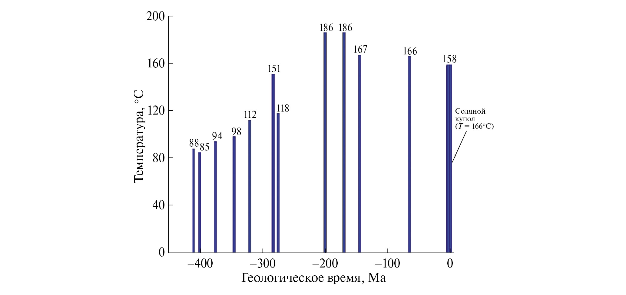 После отложения солей в эвапоритовом бассейне в конце кунгура разрез охладился, т. к. тепло расходовалось на прогрев отложившейся “холодной” соли. Однако, соль, обладая аномально высокой теплопроводностью, является тепловодом, поэтому относительно быстро, за 70 млн лет, в разрезе не только восстановилась температура, но даже возросла по сравнению с докунгурским (бессолевым) временем. После прогрева толщи солей до фоновых температур она продолжала “оттягивать” тепло из низов разреза, что обусловило монотонное падение температур в исследуемой точке за последние 200 млн лет.