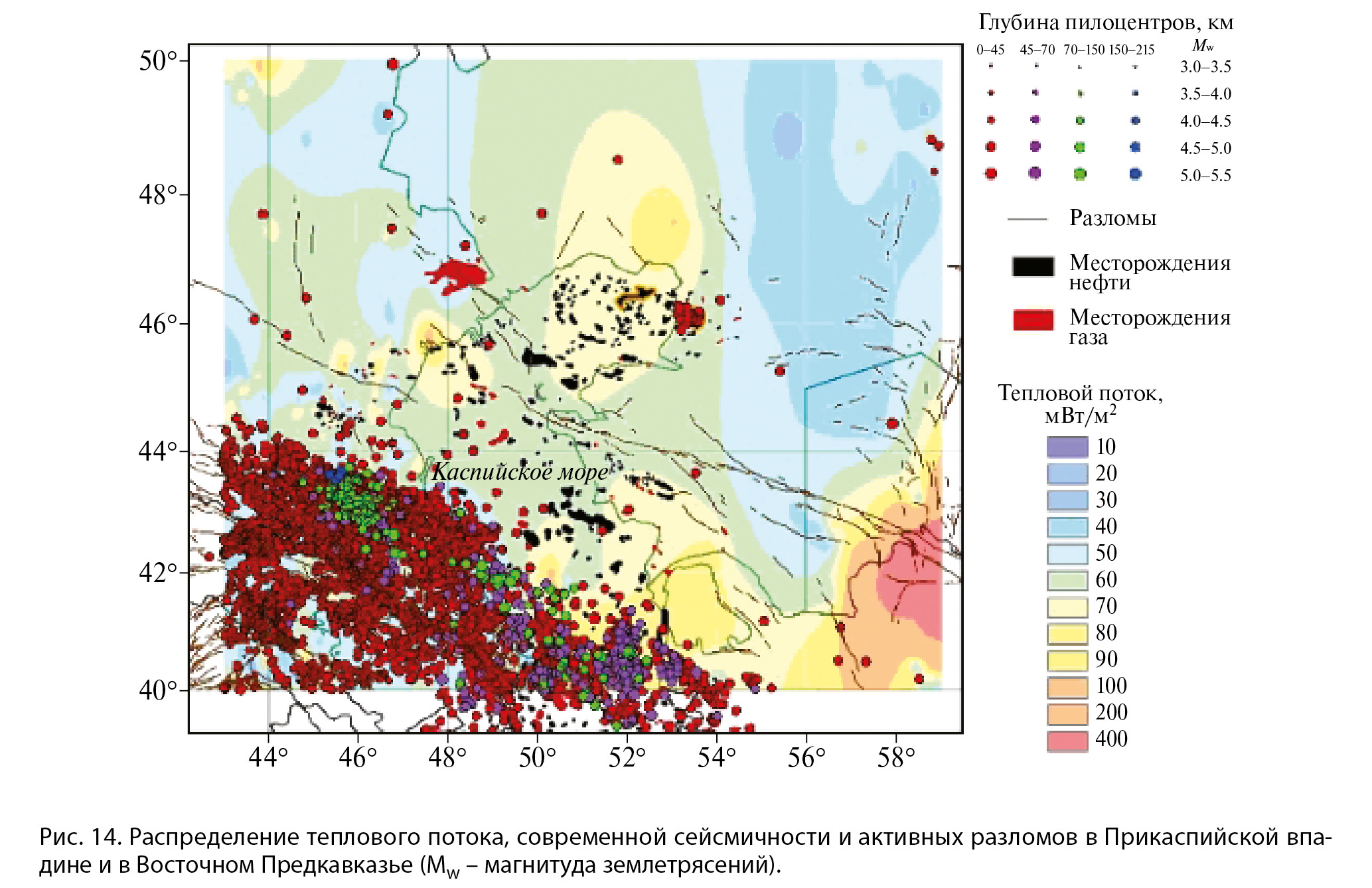 Рис. 14. Распределение теплового потока, современной сейсмичности и активных разломов в Прикаспийской впадине и в Восточном Предкавказье (Mw – магнитуда землетрясений)
