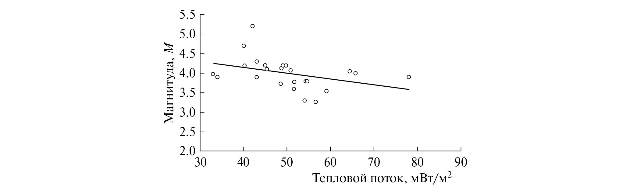 Мы сравнили средние значения теплового потока и магнитуды по квадратам 0.5° × 0.5° (табл. 5). Эмпирический коэффициент корреляции Пирсона для этих параметров оказался равным –0.38.