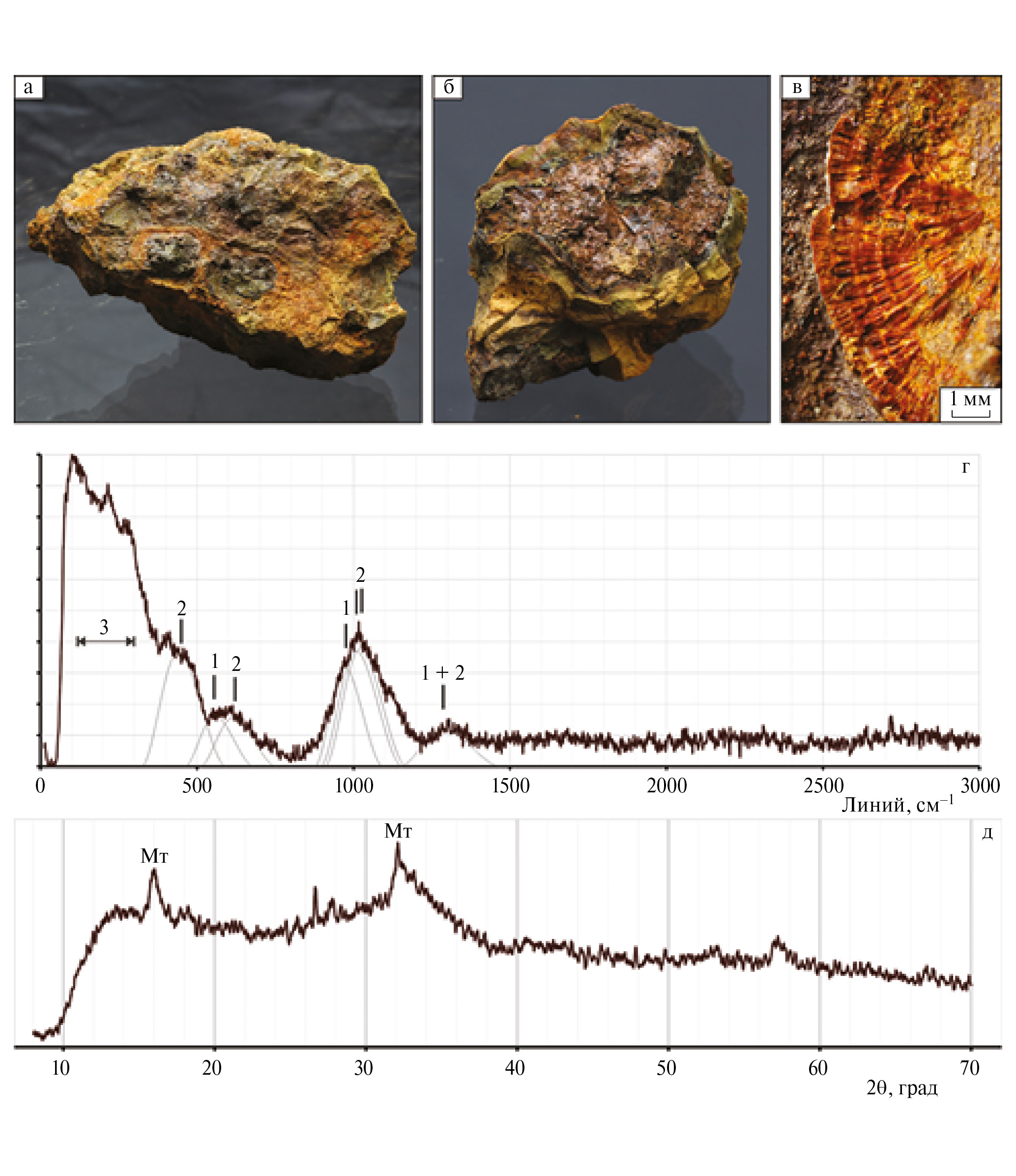 a – штуф 10×6×4 см; б – типичное строение нодулей аморфного феррофосфата. Внутренняя зона сложена светло-коричневым дельвокситом, тонкая темно-бурая внешняя зона – аморфным фосфатом, близким к ришеллиту, размер нодуля 2.5×1.5 см; в – псевдоморфоза желтого дельвоксита и красно-оранжевого фосфатистого сидерогеля по радиально-лучистому агрегату неустановленного минерала; г ‒ спектр комбинационного рассеяния, помечены диапазоны, отвечающие колебаниям: 1 – n1–4(PO4)3–, 2 – n1–4(SO4)2–, 3 – воды; д – дифрактограмма порошка частично раскристаллизованного феррофосфата, демонстрирующая суперпозицию аморфного гало и слабо выраженных рефлексов, отвечающих главным рефлексам митридатита (Мт)
