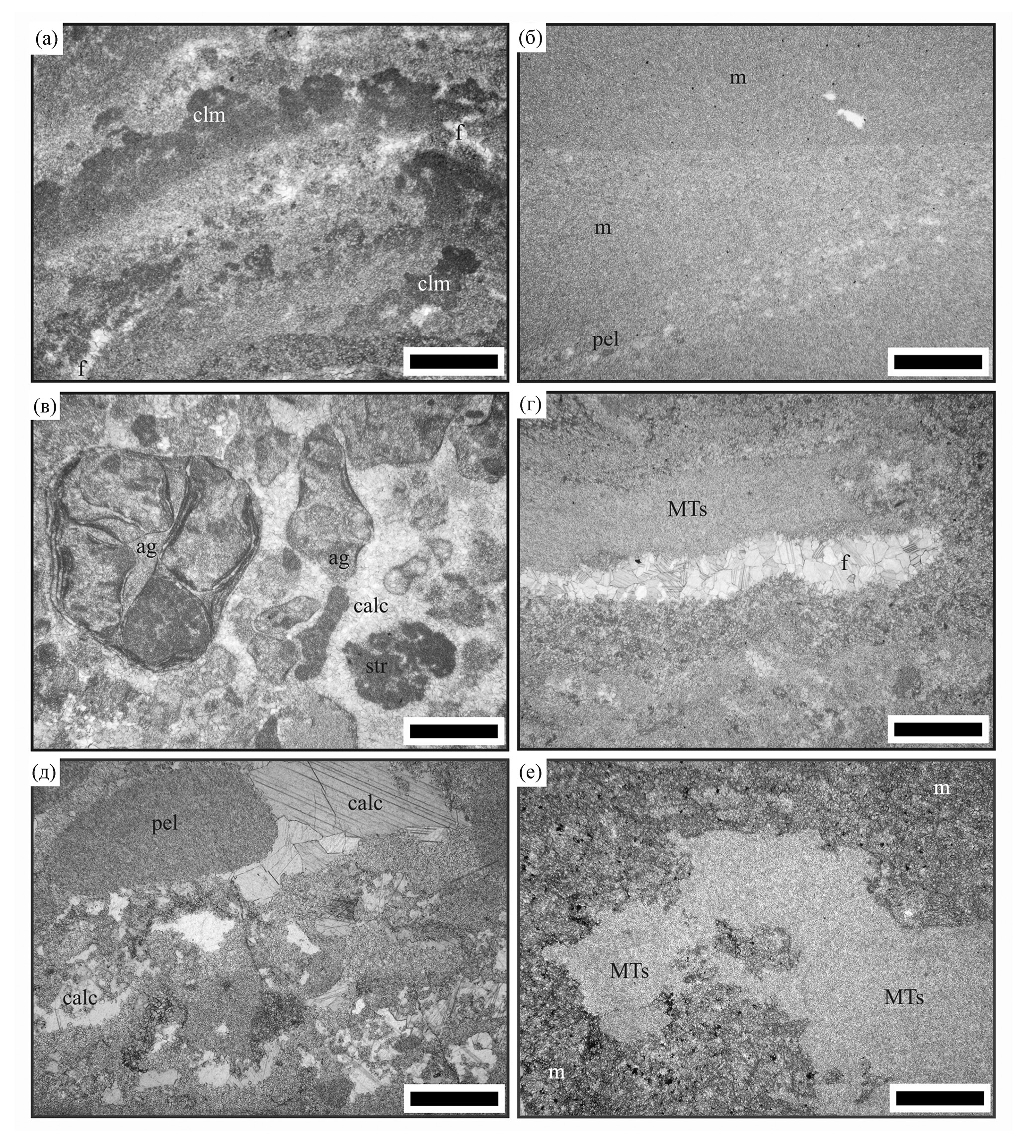 ag – агрегатные зерна; calc – кальцитовый цемент; clm – кальцимикробы; f – фенестры; m – микрит; MTs – MT-текстуры in situ; pel – пелоиды; str – строматокласты.