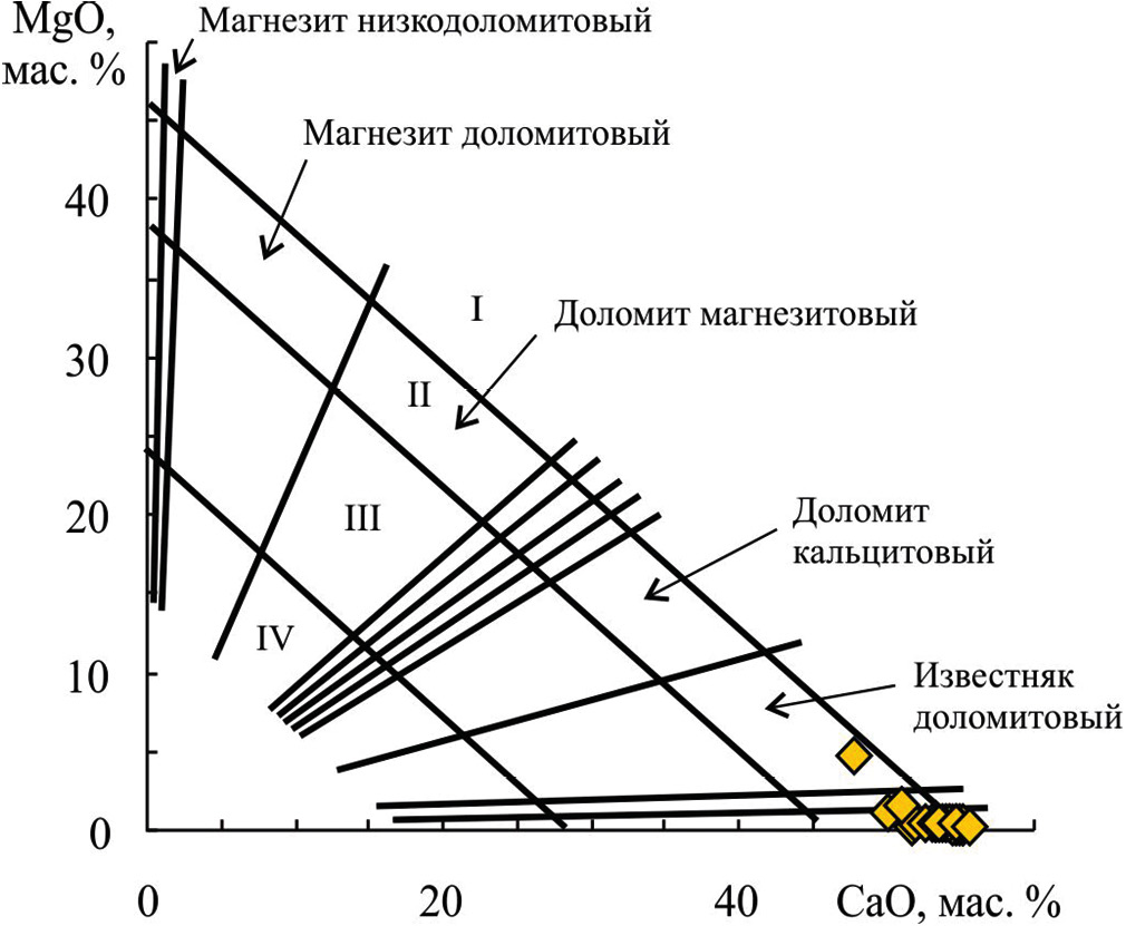 Рис. 3. Положение фигуративных точек известняков укской свиты на диаграмме CaO–MgO.