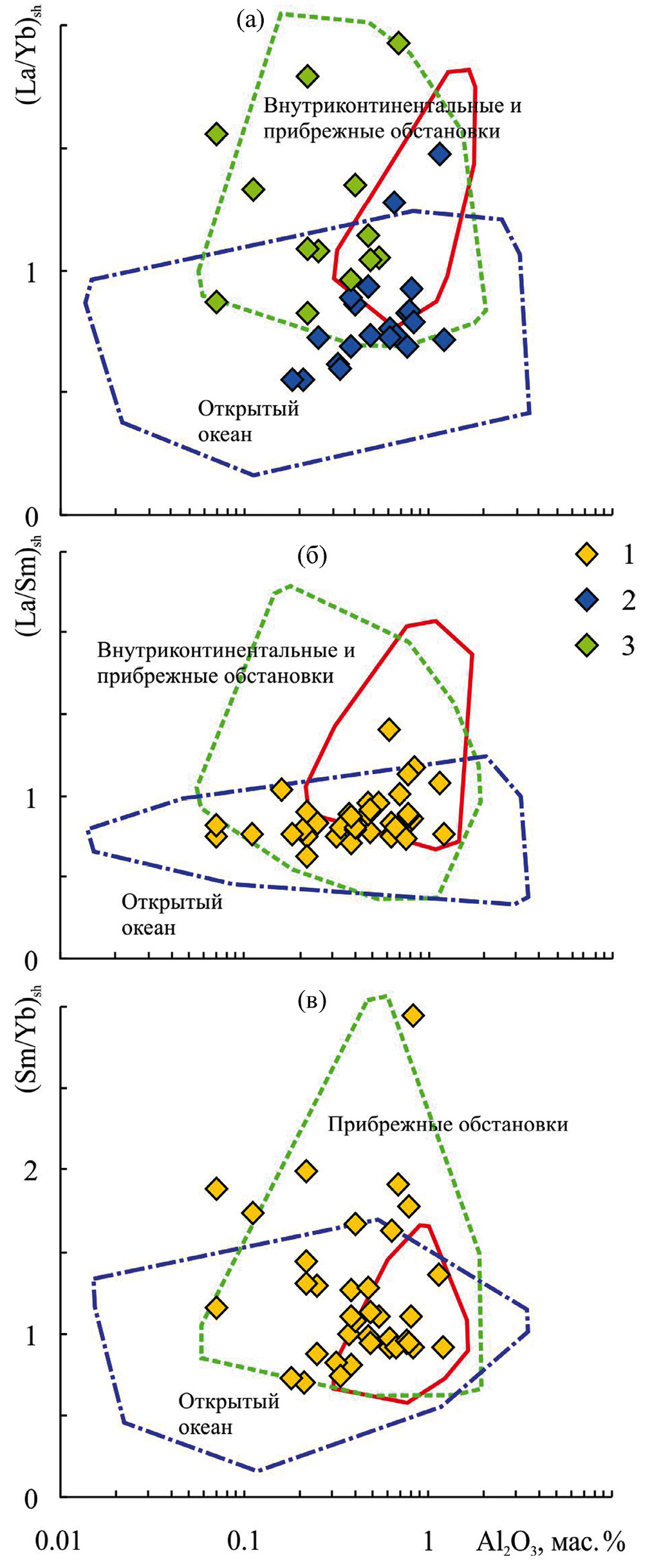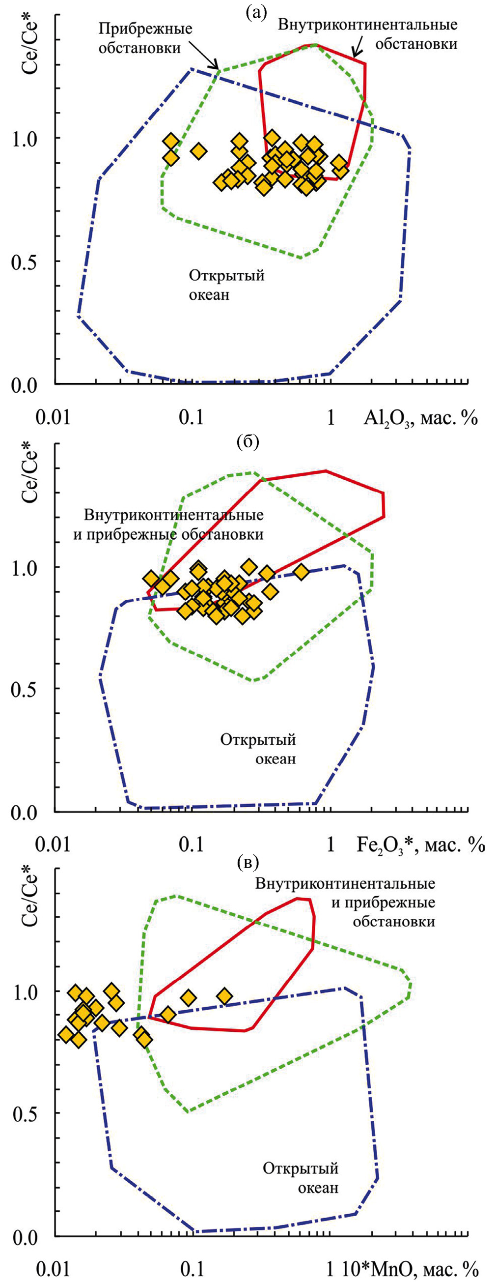 На диаграмме Fe2O3*–(La/Yb)sh также наб- людается перекрытие полей известняков всех трех групп, в то же время фигуративные точки известняков укской свиты, накапливавшихся в пределах внутреннего и верхов среднего рампа в основном приурочены к полям пресноводных и прибрежных обстановок, а точки известняков среднего рампа сосредоточены преимущественно в полях известняков открытого океана и прибрежных обстановок (рис. 6а). Эта особенность распределения известняков разных областей рампа сопоставима с той, что вырисовывается и на диаграмме Al2O3–(La/Yb)sh (см. выше). На графике Fe2O3*–(La/Sm)sh подавляющее число точек состава известняков укской свиты сосредоточено в намеченном авторами публикации [Zhang et al., 2017] поле известняков открытого океана (см. рис. 6б), но надо иметь в виду, что пересечение полей известняков разных групп и здесь достаточно значительно. Это же присуще и диаграмме Fe2O3*–(Sm/Yb)sh (см. рис. 6в), где поле внутриконтинентальных известняков практически полностью перекрыто полем известняков открытого океана. К указанной области принадлежит на данном графике и примерно треть поля прибрежных известняков.