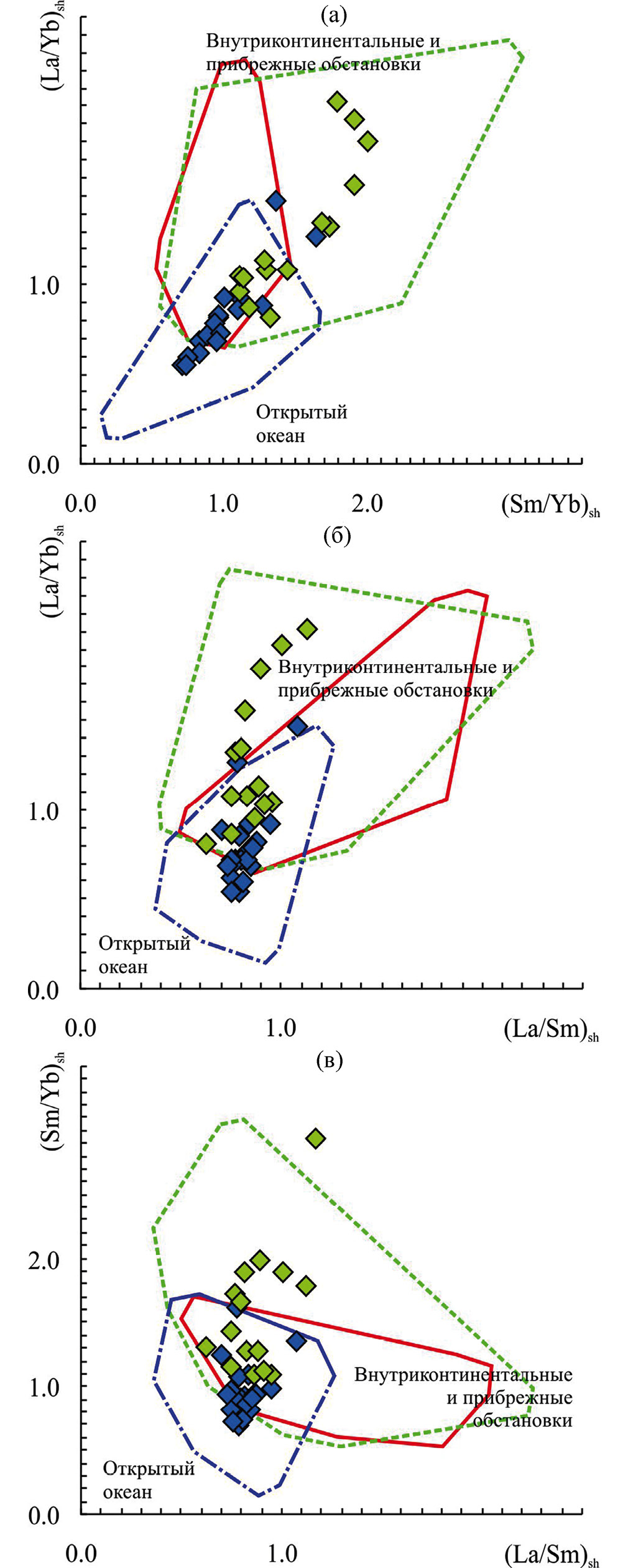 Рис. 9. Распределение точек состава известняков укской свиты (разные фации) на диаграммах (Sm/Yb)sh– (La/Yb)sh (а), (La/Sm)sh–(La/Yb)sh (б) и (La/Sm)sh–(Sm/Yb)sh (в).