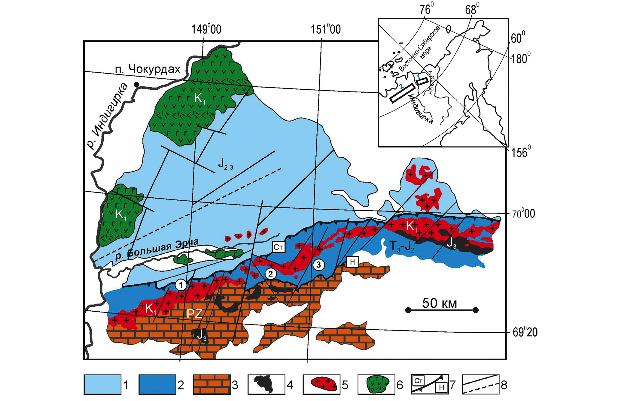 Кряж Улахан-Сис расположен в междуречье Индигирки и Алазеи (рис. 1, врезка). В его геологическом строении участвуют интенсивно деформированные нижне-среднепалеозойские карбонатные толщи Улахан-Тасского блока Омулевского террейна, терригенные и вулканогенно-терригенные образования верхнего триаса – средней юры Нагонджинского террейна, верхнеюрские вулканиты реликтов Уяндино-Ясачненского вулканогенного пояса и нижнемеловые гранитоиды Северного батолитового пояса (см. рис. 1). Структуры кряжа Улахан-Сис являются продолжением структур кряжа Полоусный и относятся к тектоническим элементам широтного отрезка Колымской структурной петли, образовавшейся в результате аккреции Колымо-Омолонского супертеррейна (микроконтинента) к Северо-Азиатскому кратону в поздней юре и начале раннего мела [Зоненшайн и др., 1990; Оксман, 2000; Оксман и др., 2003; Тектоника …, 2001; Парфенов и др., 2003; Соколов, 2010; Конс- тантиновский, Липчанская, 2011; Прокопьев, 2011; Nokleberg et al., 2001].