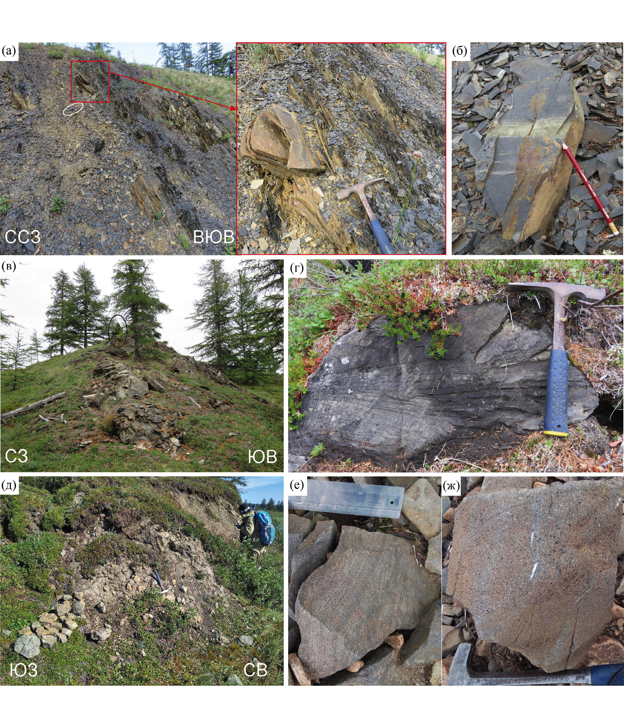 Рис. 4. Обнажения среднеюрских отложений кряжа Улахан-Сис (а–г – по р. Нижний Тогучан, д–ж – по р. Кусаган-Юрях).