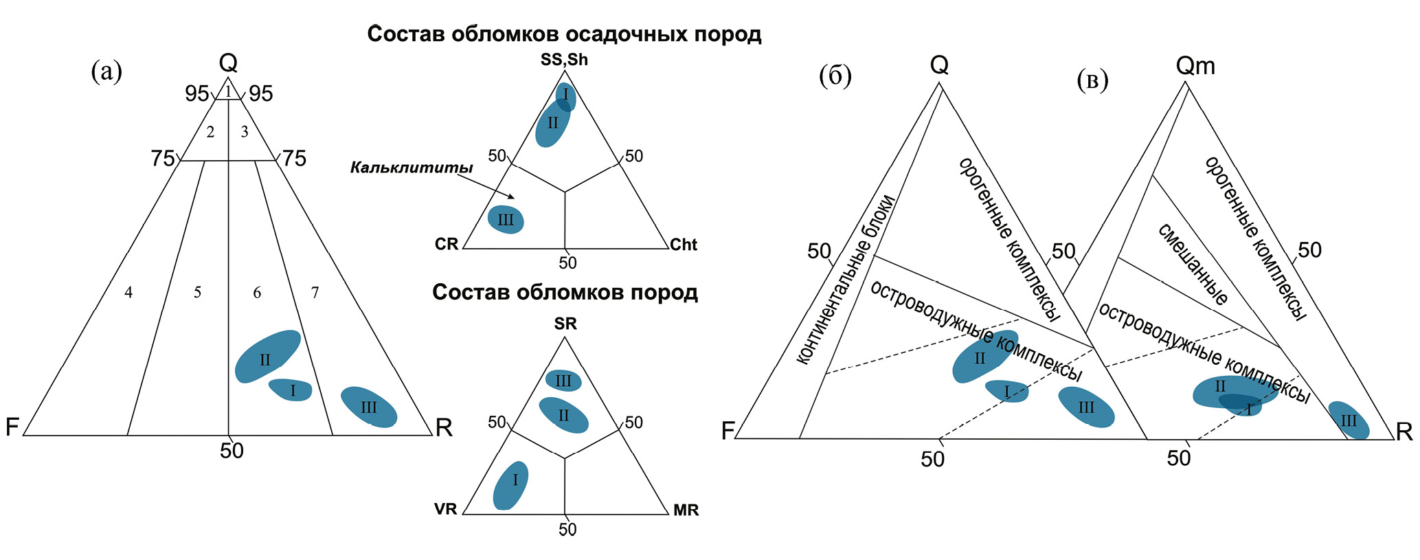 Q – кварц (моно- и поликристаллический), Qm – кварц (монокристаллический), F – полевые шпаты, R – обломки пород, MR – обломки метаморфических пород, VR – обломки вулканогенных пород, SR – обломки осадочных пород, CR – обломки внебассейновых карбонатных пород, Cht – обломки кремней, SS, Sh – обломки песчаных и глинистых пород.