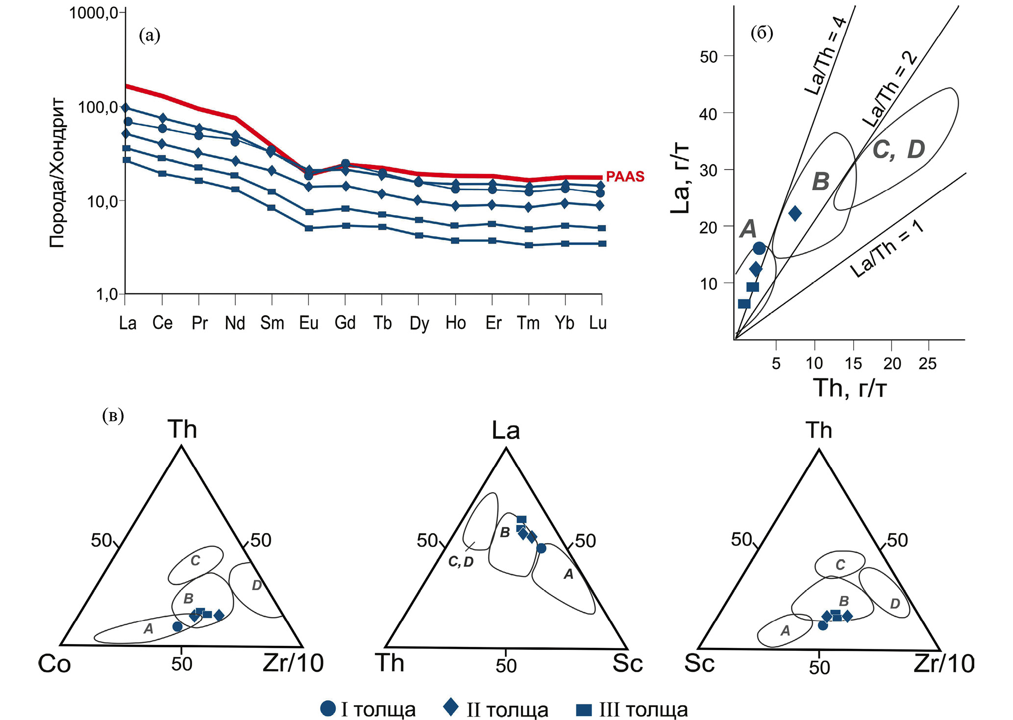Рис. 9. Распределение нормализованных по хондриту [McDonough, Sun, 1995] редкоземельных элементов в среднеюрских песчаниках, совместно с данными по PAAS [Тейлор, МакЛеннан, 1988] (а), диаграммы для классификации тектонических обстановок [Bhatia, Crook, 1986] (б, в).
