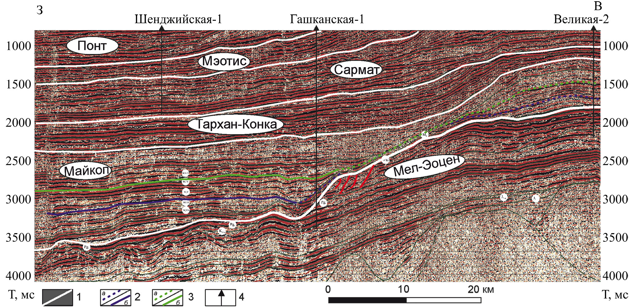 1 ‒ границы сейсмокомплексов; 2, 3 ‒ границы внутри майкопского сейсмокомплекса: 2 ‒ соленовского возраста (а ‒ эрозионные, б ‒ согласные), 3 ‒ позднекалмыцкого (предположительно) возраста (а ‒ эрозионные, б ‒ согласные); 4 ‒ скважины. Положение профиля см. рис. 1