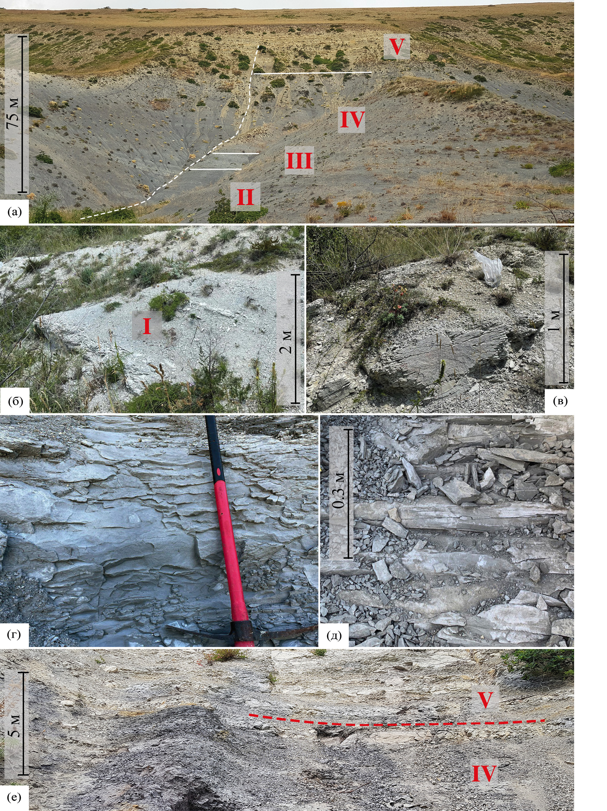 а – общий вид обнажения “Б”, римскими цифрами показаны номера пачек. Пунктирной линией показан интервал отбора проб; б – общий вид обнажения “А”; в – серые мергели пачки I; г – неяснослоистые серые известняки (вакстоуны) пачки II (слой 6); д – серые известняки (пакстоуны) пачки III (слой 12); е – граница между верхнемаастрихтскими серыми мергелями пачки IV и нижнедатскими серо-желтыми, мелкозернистыми, глауконитсодержащими полевошпат-кварцевыми песчаниками пачки V