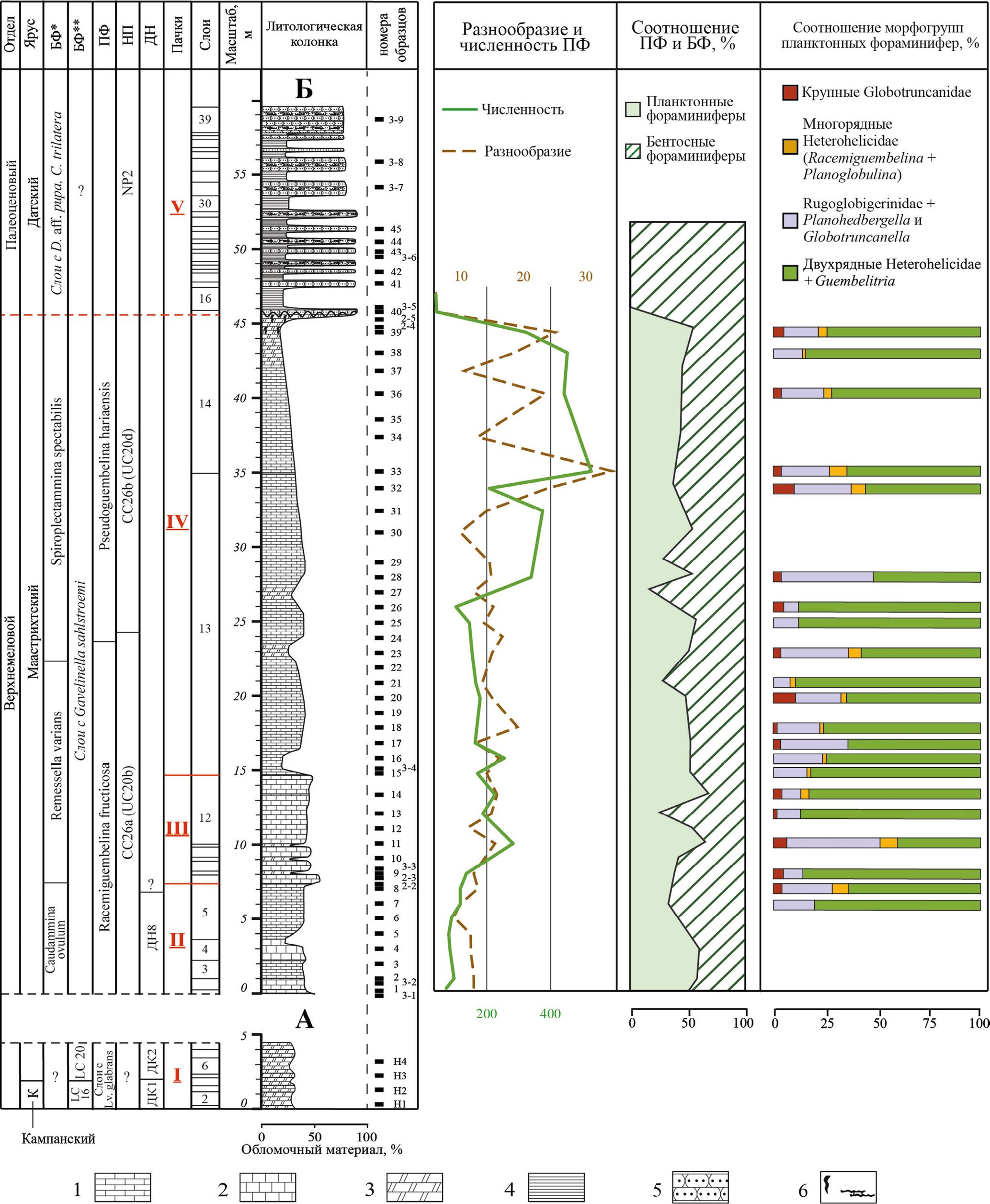 Первый этап (пачка II – основание пачки IV, обр. 1–17) отвечает началу позднего маастрихта. Породы характеризуются преимущественно низкой численностью БФ (в среднем 760 раковин/г) и относительно невысоким видовым разнообразием (в среднем 8‒12 родов). Отмечается два аномальных эпизода: ранний, с высоким разнообразием (на уровне обр. 1, 22 рода), и поздний, с высокой численностью (в интервале обр. 11‒13, 970‒2890 раковин/г породы), средним разнообразием (11‒12 родов).