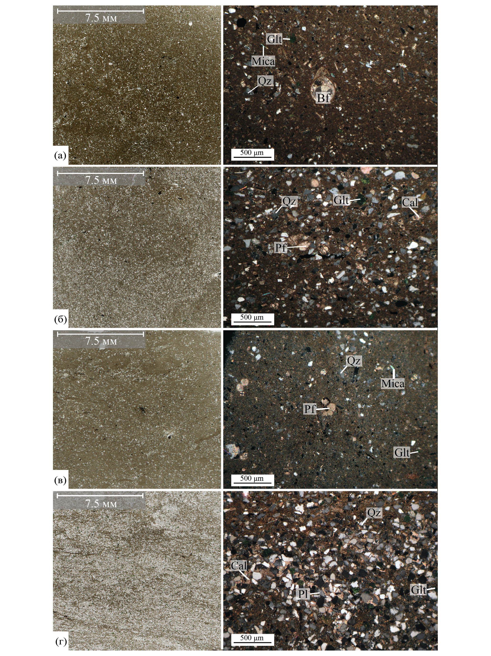 Bf – бентосные фораминиферы, Pf – планктонные фораминиферы, Qz – кварц, Glt – глауконит, Mica – гидрослюда, Pl – плагиоклаз